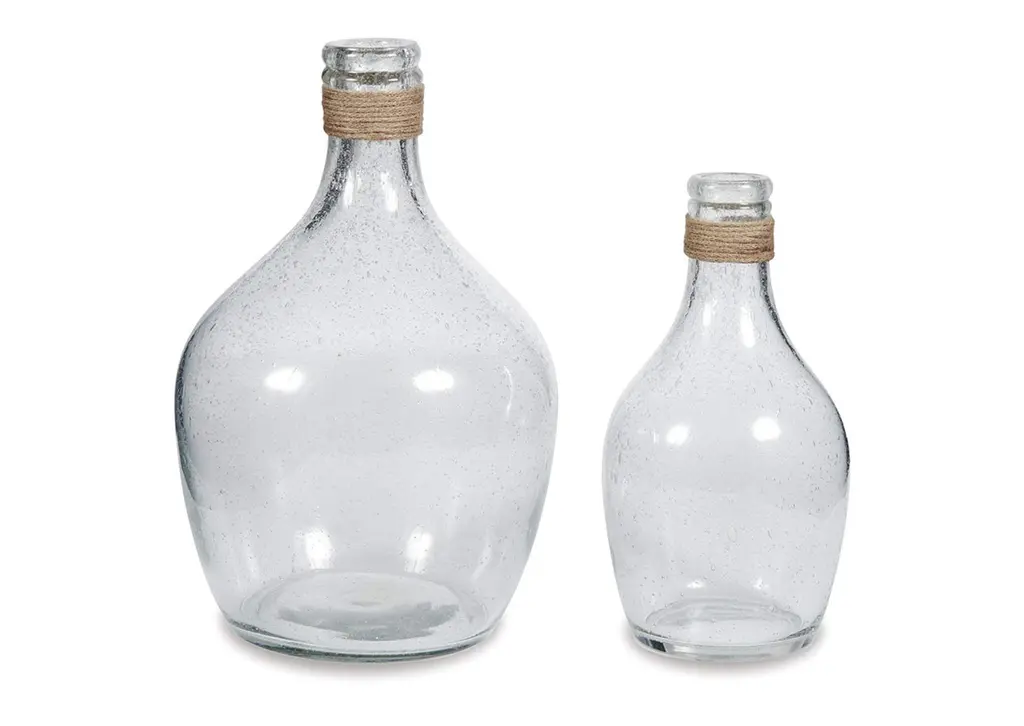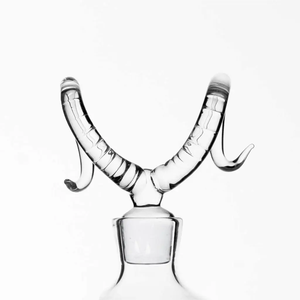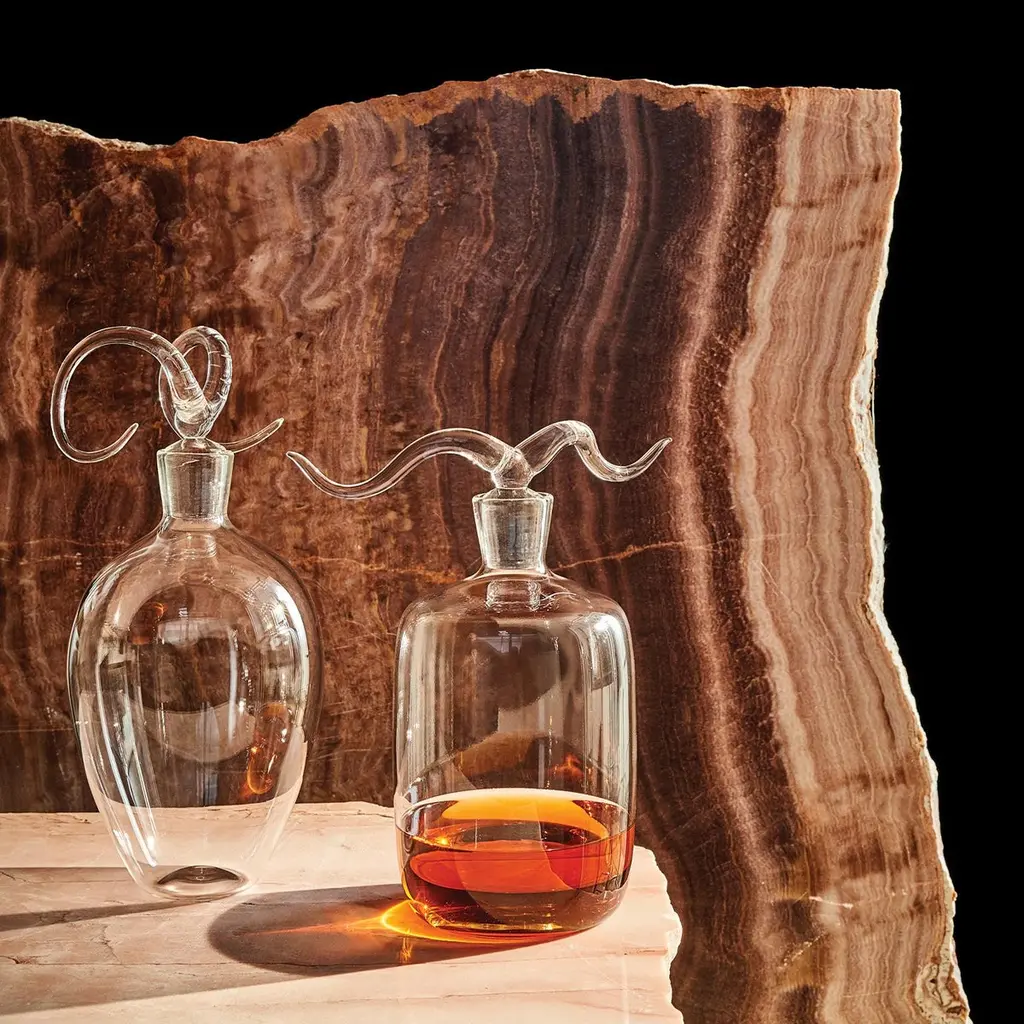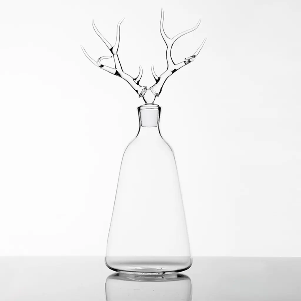 'Trophy Bottles Set' Hand-blown Glass bottles.The Trophy Bottles Set by Simone Crestani. Set includes 1 Deer Bottle, 1 Longhorn Bottle, and 1 Bighorn Bottle. 3 pieces in total."A collection of bottles with linear shapes that reserve a surprise at the top. Elk, antelope, deer or buffalo? Each trophy represents in detail the horns of a wild animal and dedicates a poetic hymn to the inhabitants of the most pristine nature."Dimensions: 18x12x34 - 19x11x28 - 12x12x29Volume for Bottles: Can easily contain 1 bottle of wine.Materials: Borosilicate GlassNote Since everything is handmade the product that you will receive may be slightly different than the photos.