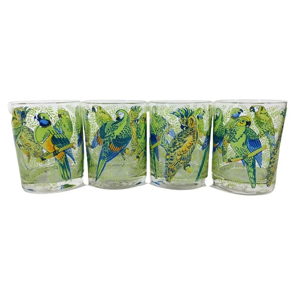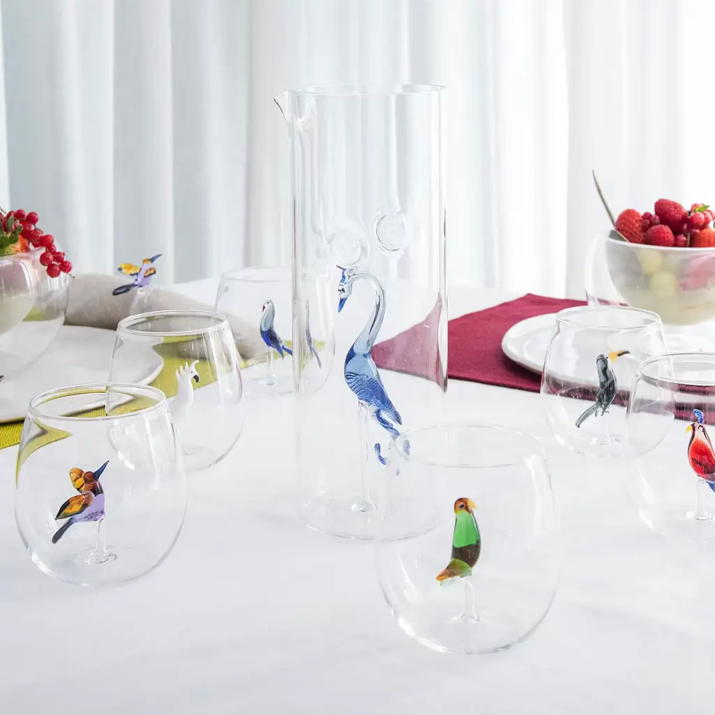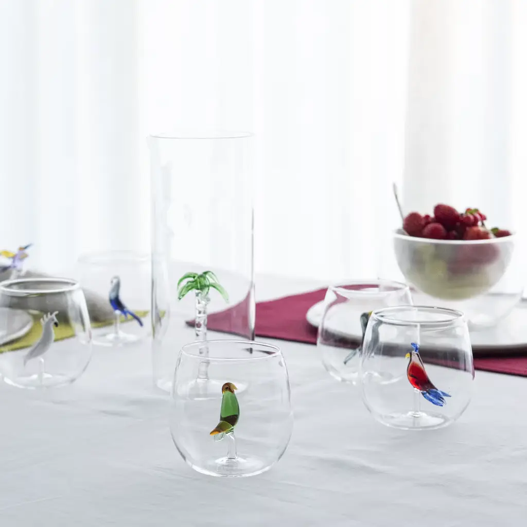 Featuring six tumblers (10 H. x 8 ⌀ cm) in blown glass, this refined set of six pieces makes a strikingly simple yet dynamic addition to any table setting. Part of a collection inspired by the colorful and vibrant nature of tropical islands, each glass is adorned inside with a different bird: a white cockatoo, a bird of paradise, a red bird, a toucan, a parrot, and a hummingbird. The collection also includes a pitcher with a blue peacock that is sold separately.