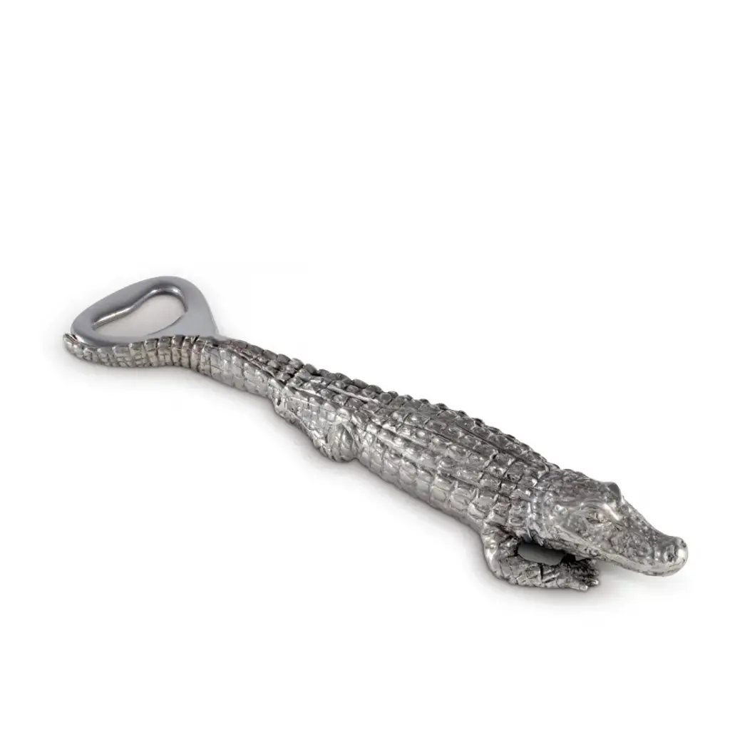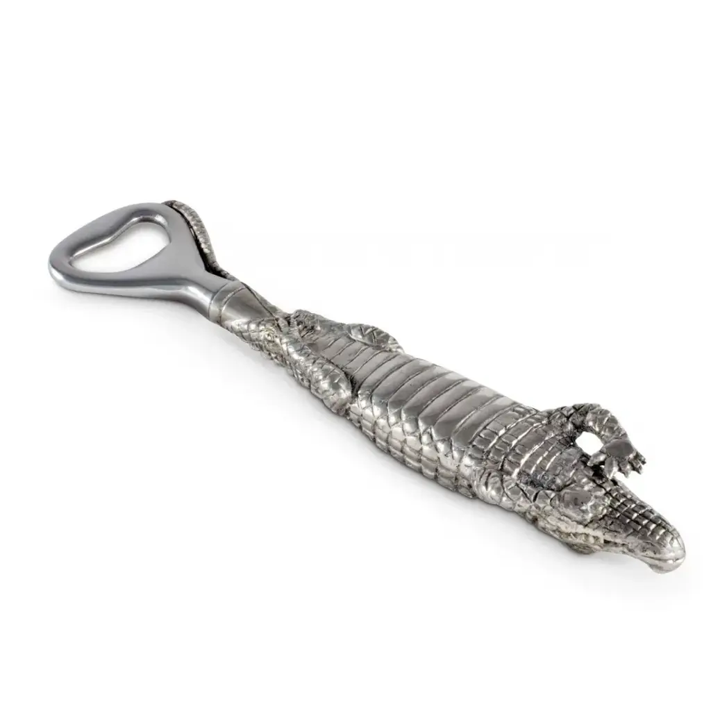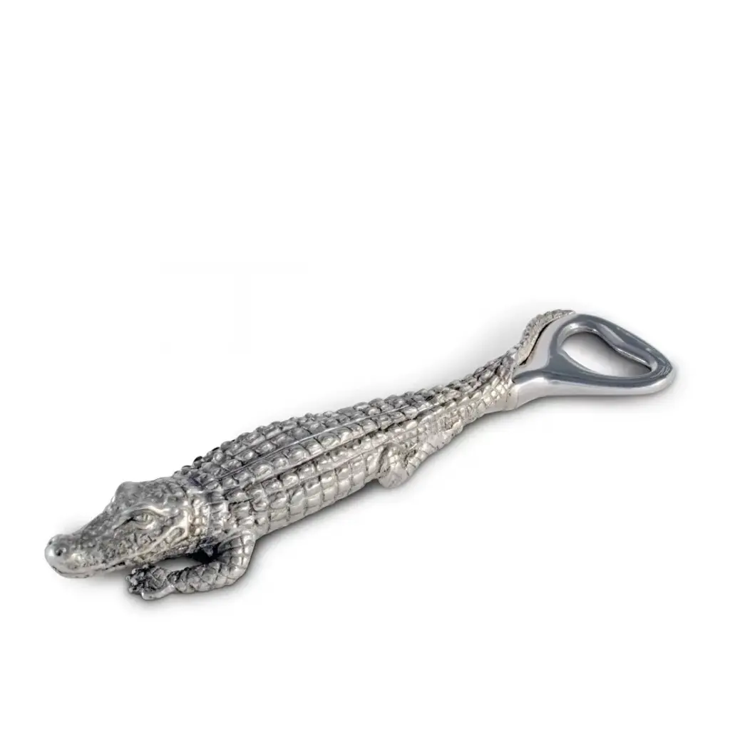 Vagabond House's pewter handled Alligator Bottle opener is a statement of relaxed tropical style. The pewter Alligator handle is realistically detailed, adding a touch of character to every bottle opened. Vagabond House Bottle openers are large enough to easily open all bottles, including highly stylized bottles of micro-brew and specialty ale. Vagabond House is a family-owned American company specializing in fine pewter tableware, servingware and giftware. Largely inspired by nature, their exclusive products are designed to be unique, functional heirlooms for those who seek to express tradition and style in both family and formal entertaining.