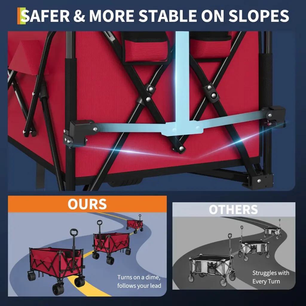 Heavy Duty Beach Wagon Cart - All-Terrain Collapsible Utility Wagon with 350lb Capacity (Red, Medium)1?? Professional Mobility System? 4 oversized 7" x 4" all-terrain wheels (2 locking front + 2 fixed rear)? 360¡ã swivel steering with sealed ball bearings? Sand-tread TPU tires for beach/grass/rocky terrain2?? Commercial-Grade Construction? 1.2" reinforced steel frame with anti-corrosion coating? Double-stitched 600D Oxford fabric with ripstop lining? 350lb dynamic / 500lb static capacity3?? Smart Storage Solutions? 38.5"L x 22.8"W x 35"H cargo space (5.8 cu.ft capacity)? Integrated convenience features:¡ú 2 insulated cup holders (fits 32oz bottles)¡ú Side organizer pocket (9" x 5")¡ú Removable waterproof cover4?? Instant One-Second Folding? Patented quick-release mechanism? Ultra-compact storage: 8.6" x 10.2" x 26.8"? Adjustable telescoping handle (34"-43.3" height)5?? Multi-Purpose Performance? Perfect for:¡ú Beach outings (holds 4 chairs + cooler)¡ú Camping trips (fits 2 sleeping bags + gear)¡ú Garden/retail use?? Technical Specifications? Unfolded: 38.5"L x 22.8"W x 35"H? Wheelbase: 32"? Ground Clearance: 2.5"?? Performance Features¡ú 200¡ã wheel rotation¡ú 4:1 steering ratio¡ú IP54 water resistance?? Premium Applications? Family beach days ? Sports events? Farmers markets ? Warehouse logistics?? Package Includes?? Folded wagon assembly?? Storage cover & strap?? Quick-start guideYour ultimate heavy-hauling companion - built for adventure wherever you go.