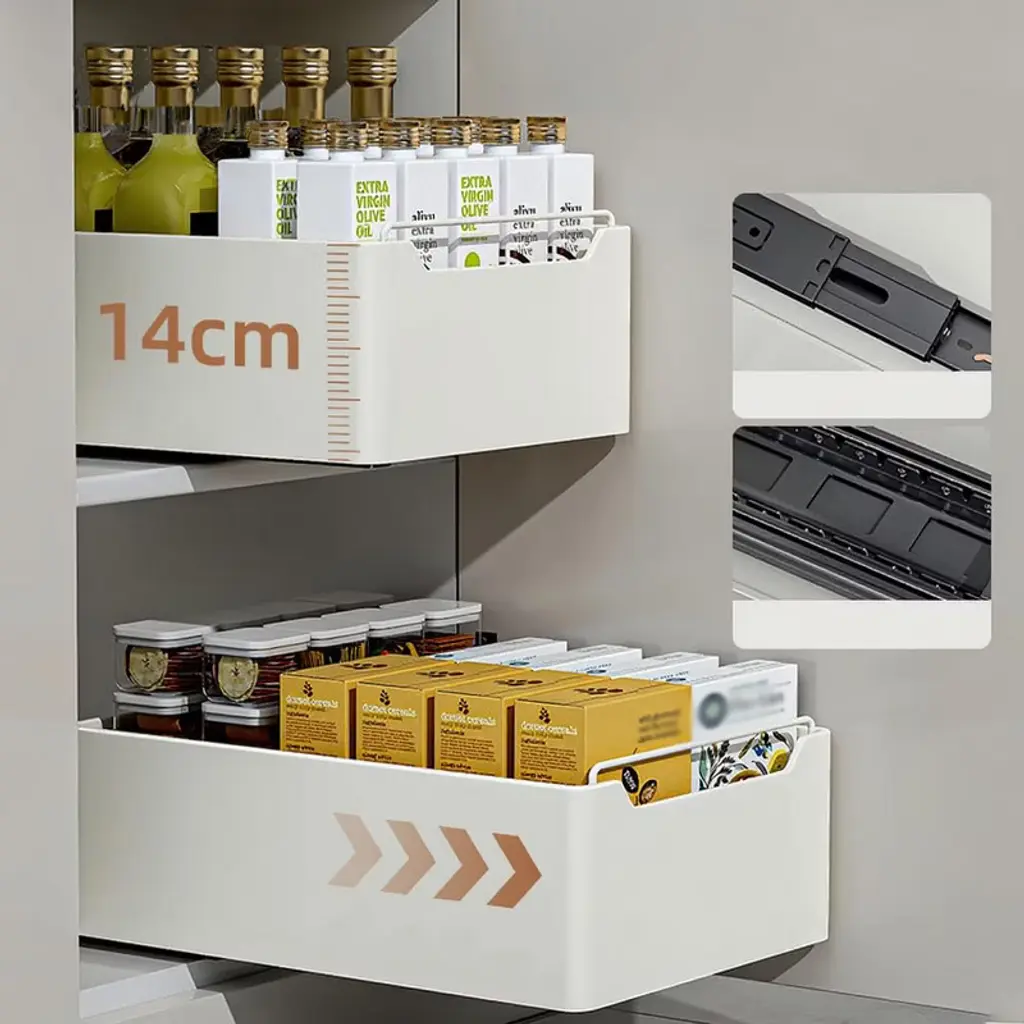 "Pull Out Cabinet Organizer - No Drill Sliding Drawer for Kitchen & Pantry Storage (White, 20cm Width)"Product Highlights:Easy No-Drill InstallationThis TROPOW sliding cabinet organizer features strong adhesive backing for hassle-free, tool-free installation¡ªno drilling, screws, or nails required. Simply attach it to your cabinet, pantry, or bathroom shelf for instant storage. Ensure your cabinet has enough space (minimum 43D x 20W x 14H cm) for smooth operation.Ultra-Smooth & Silent GlidingEquipped with a high-performance damping rail tested 70,000 times, this pull-out tray ensures whisper-quiet sliding without annoying squeaks or jams. The telescopic design allows full extension (up to 43 cm depth) for easy access to stored items.Heavy-Duty Metal ConstructionMade from durable, high-quality metal, this organizer can hold a significant weight (item weight: 2200g) while maintaining stability. The sleek white finish resists stains and blends seamlessly with modern kitchens.Space-Saving & Versatile StorageWith compact dimensions (20W x 14H cm), it fits tight spaces while maximizing vertical storage. Perfect for spices, condiments, utensils, or bathroom essentials, keeping everything neat and within reach.Multi-Purpose OrganizationIdeal for kitchens, pantries, bathrooms, and offices, this sliding basket helps declutter cabinets and shelves. Its open design ensures quick visibility and accessibility, making it a must-have for small-space organization.Key Specifications:Color: WhiteMaterial: Sturdy metalWeight: 2200 gExtended Depth: 43 cmInstallation: Adhesive-backed (no tools needed)