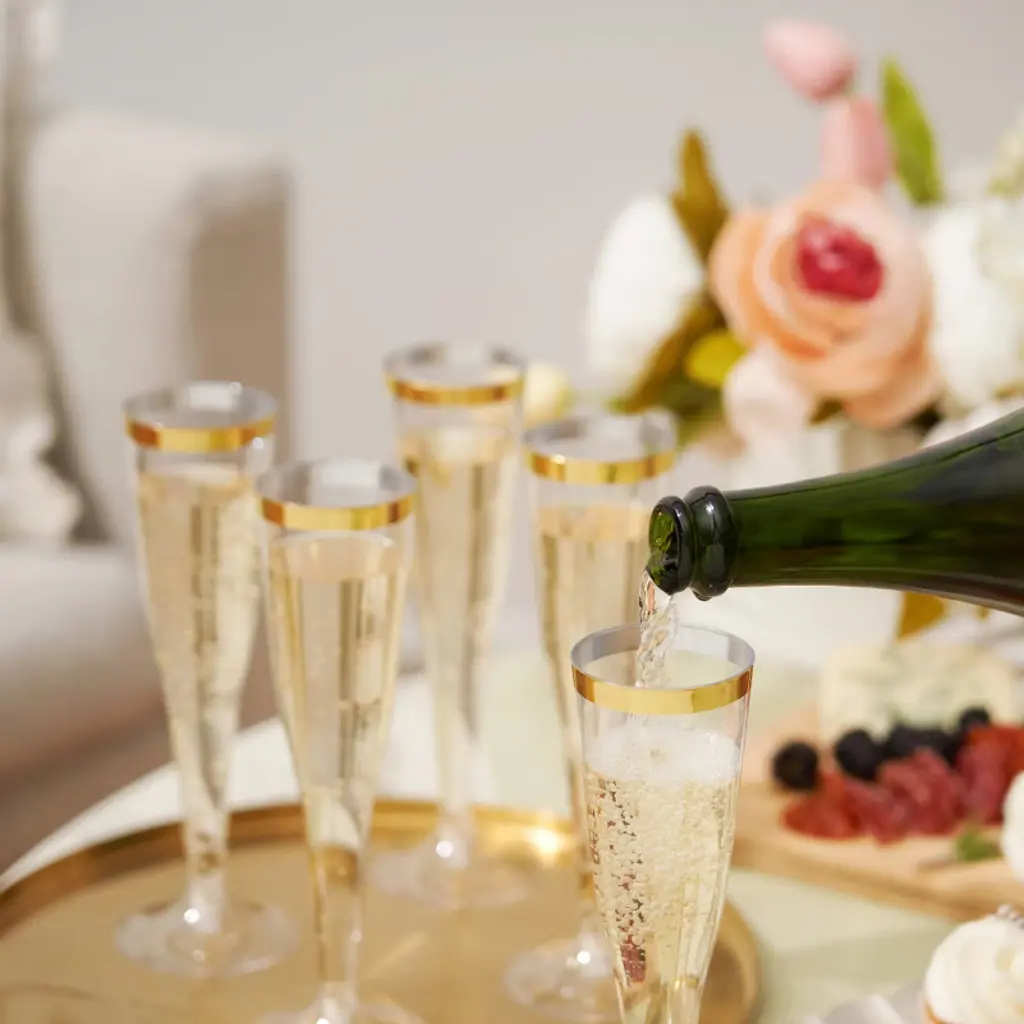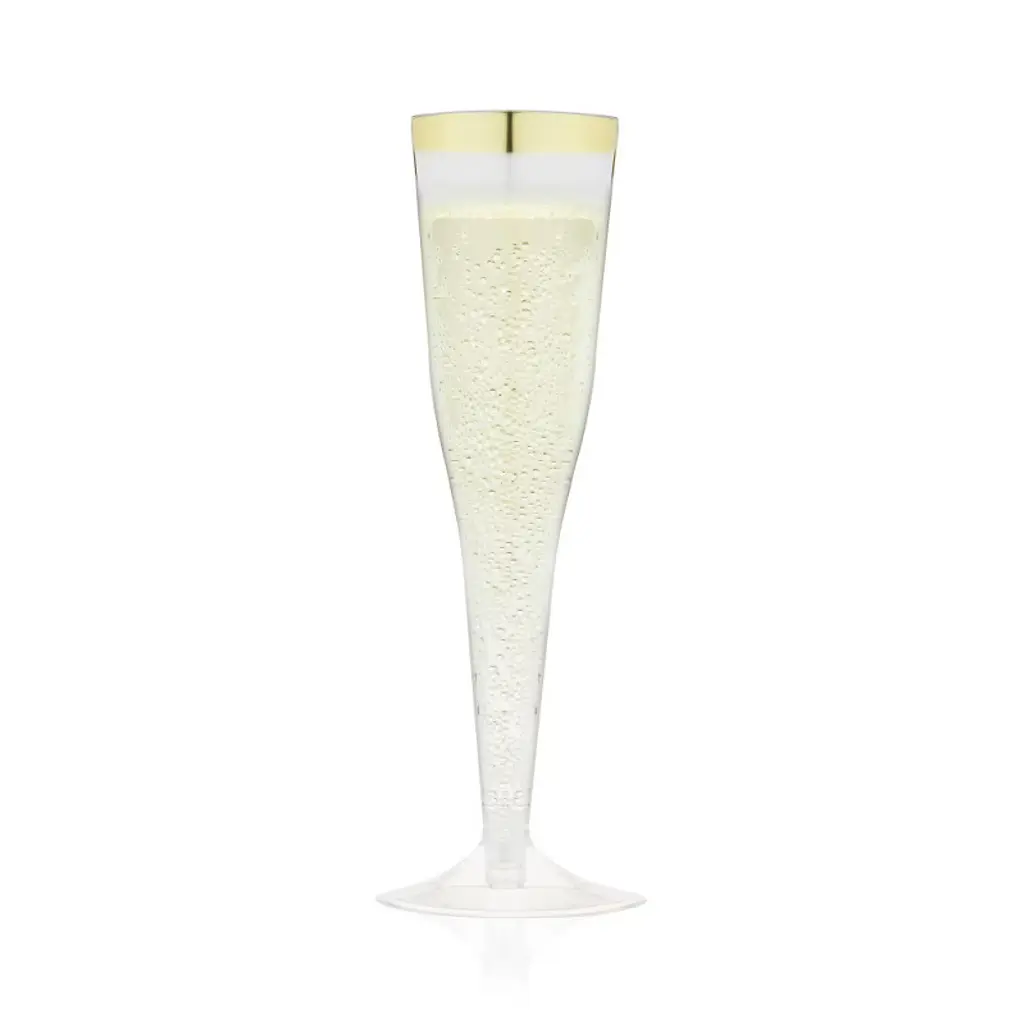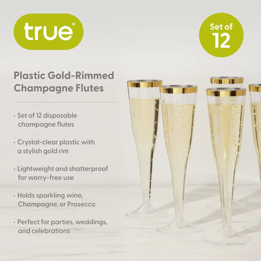 True Party Gold Rimmed Champagne Flutes, Disposable Stemmed Clear Plastic Glasses For Sparkling Wine Outdoors Parties, 5.5 Oz Set Of 12, Clear