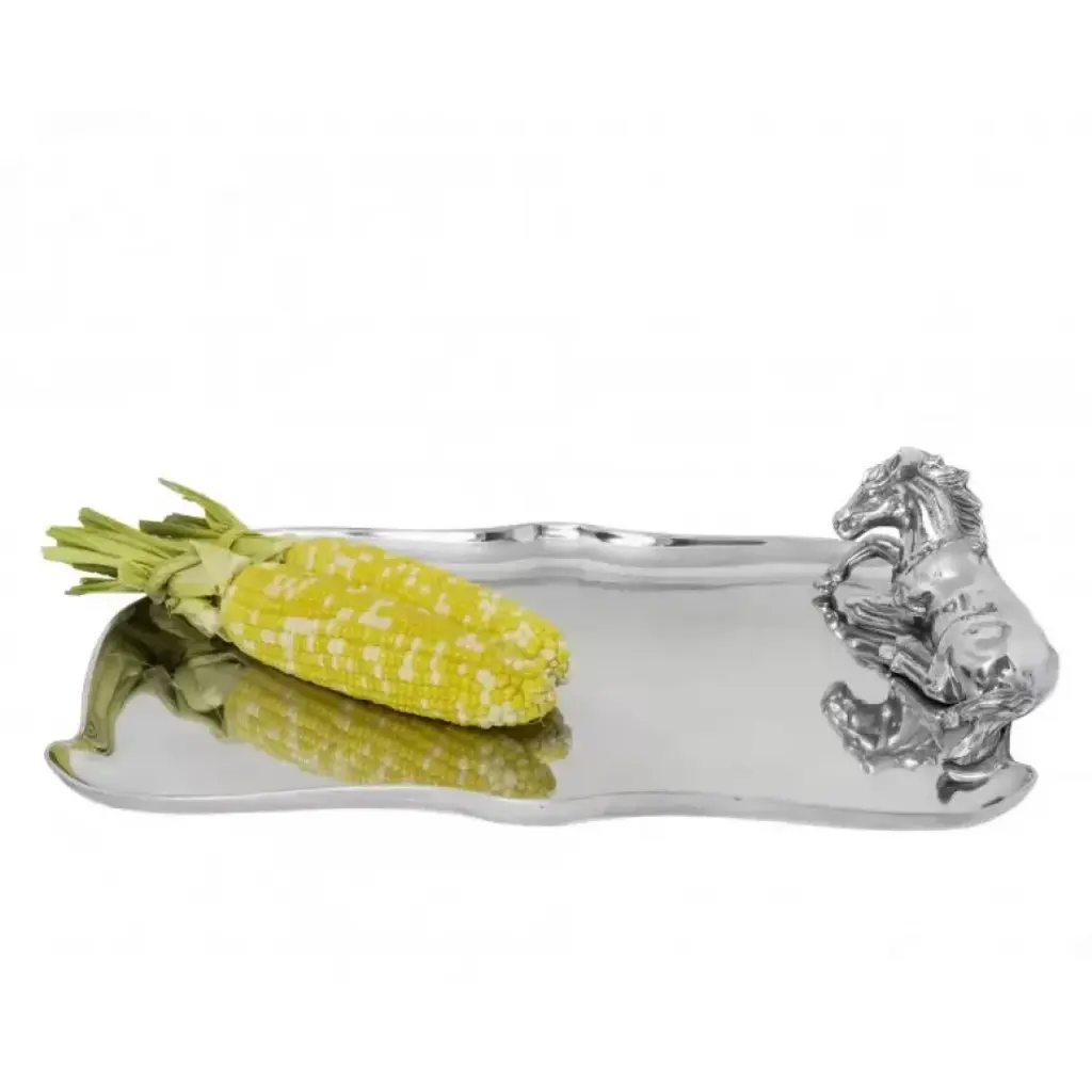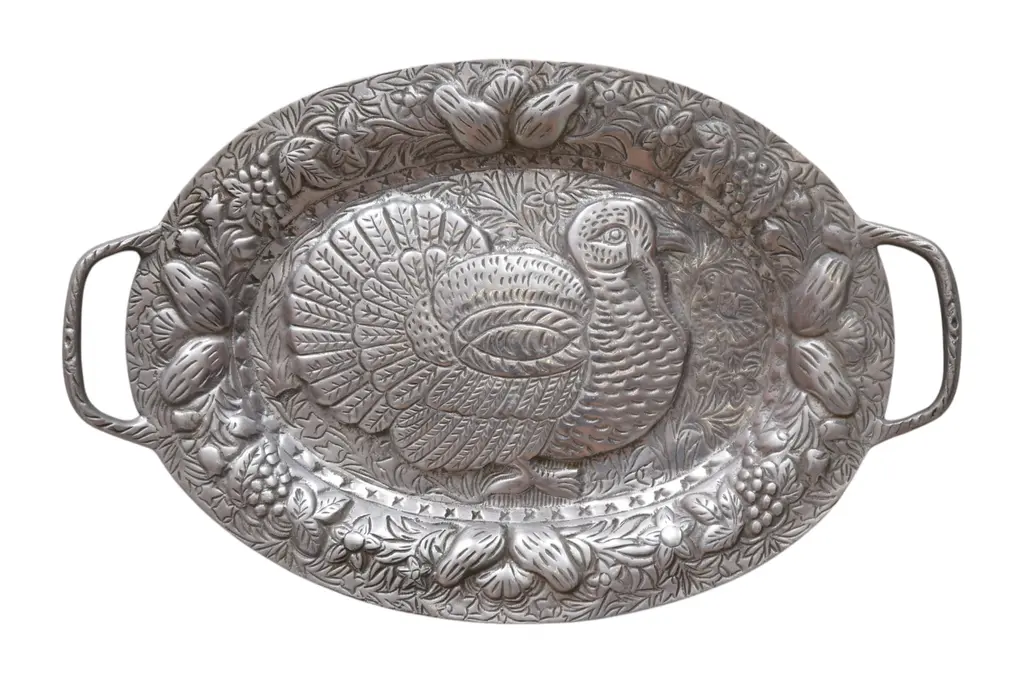 Flatten out your meat display with this Turkey Oval Platter from Arthur Court. A turkey balloons into a circular dish as its small head pushes up against one of the side edges. Exceptionally defined grapes and greenery adorn both sides of this handmade, aluminum tray, while intricate feathers fan out around them in beautiful arrangements of detail.