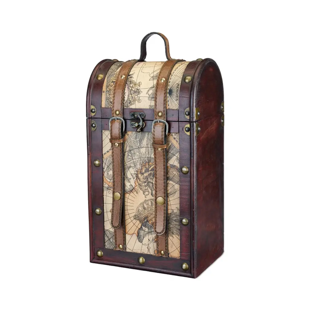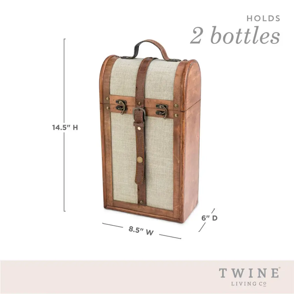 Twine Vintage Trunk Wine Bottle Gift Box, Wood Wine Box With Lid And Handle, Holds 2 Bottles, Wood, Faux Leather, Brass, Cloth