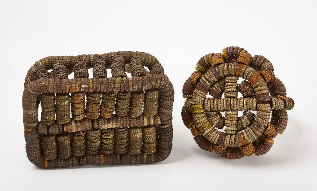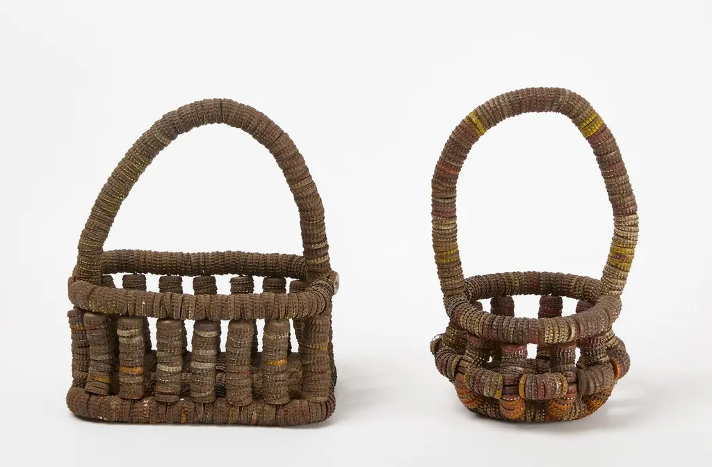 Two folk art bottlecap baskets. H 15-3/4" D 8-3/4"H 14-1/2" W 12-3/4" D 9".