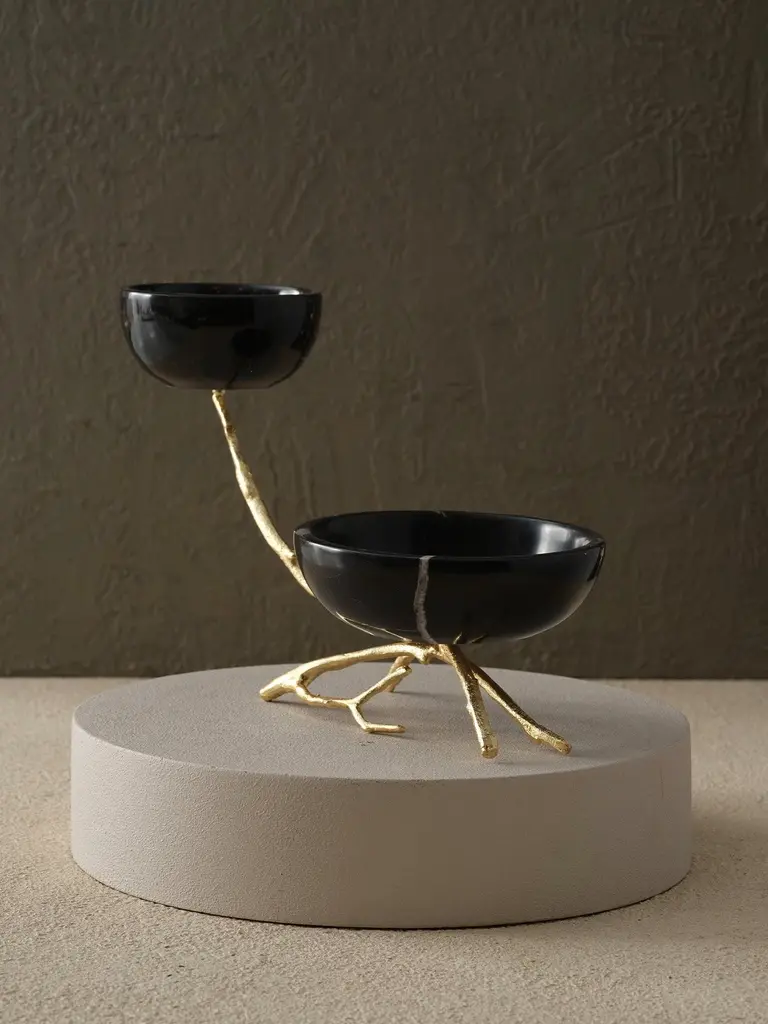 Two-Tier Black Marble Serving Bowls With Gold Branch Base
