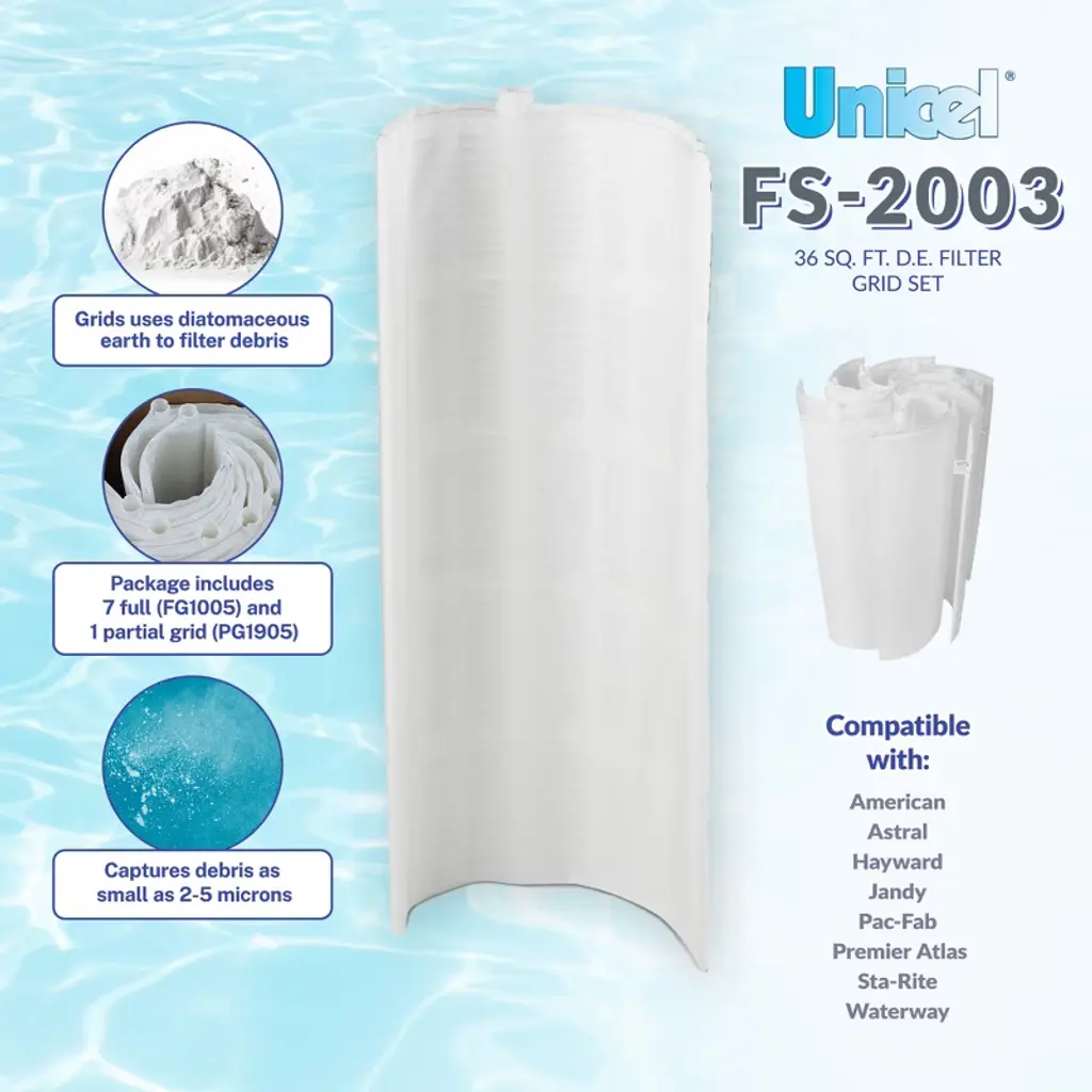 Enjoy your time in the water and get the ultimate pool maintenance solution with the Unicel FS-2003 DE Grid Replacement Filter Set. Each grid is engineered with fabric that is constructed with a high yarn count of fine denier fibers, which yields an optimal permeability to ensure maximum efficiency and durability. Use this grid with DE powder for pool filter applications to trap dirt and debris down to an average of 2 to 5 microns. What's more, the filter media ensures less resistance to water flow, longer cycles between backwashes, and great DE caking properties for efficient debris and particle capture. Compatible with 36-square-foot systems manufactured by Hayward Pool Products, Pentair Pool Products, American Products, Pac Fab, Sta-Rite, Astral, Waterway Plastics, and Jacuzzi, this grid can be used as an in ground or above ground pool filter. This is a set of 7 full and 1 partial grid parts for full replacement. This Unicel FS-2003 DE Grid Replacement Set is the clear choice to keep your swimming pool water sparkling. Why Unicel? For over 50 years, Unicel has been developing and manufacturing elements for both the pool and spa OEM market and the wholesale distribution trade. With quality components and 50+ years of experience operating and sourcing in the USA, Unicel is recognized as the industry leader.