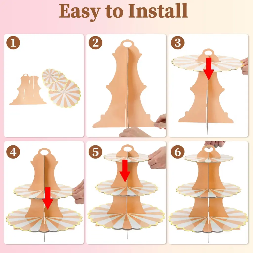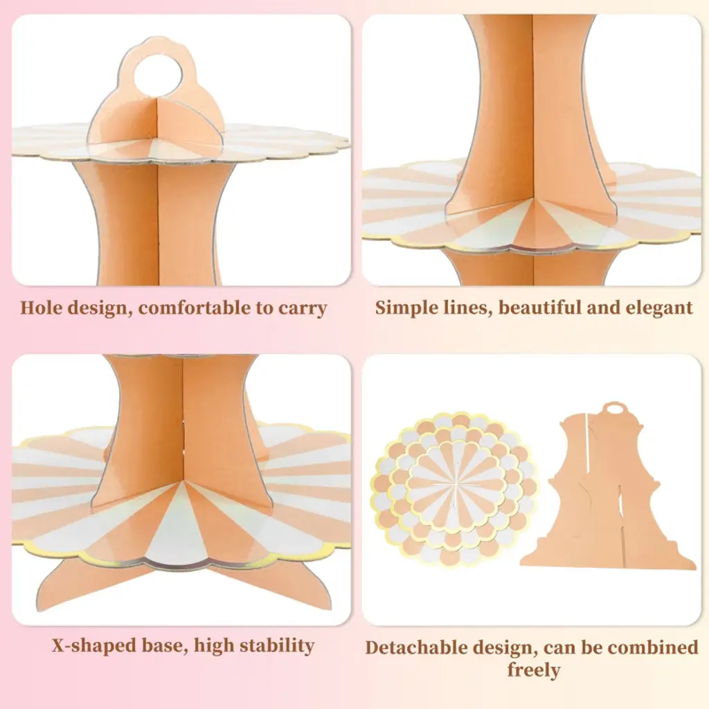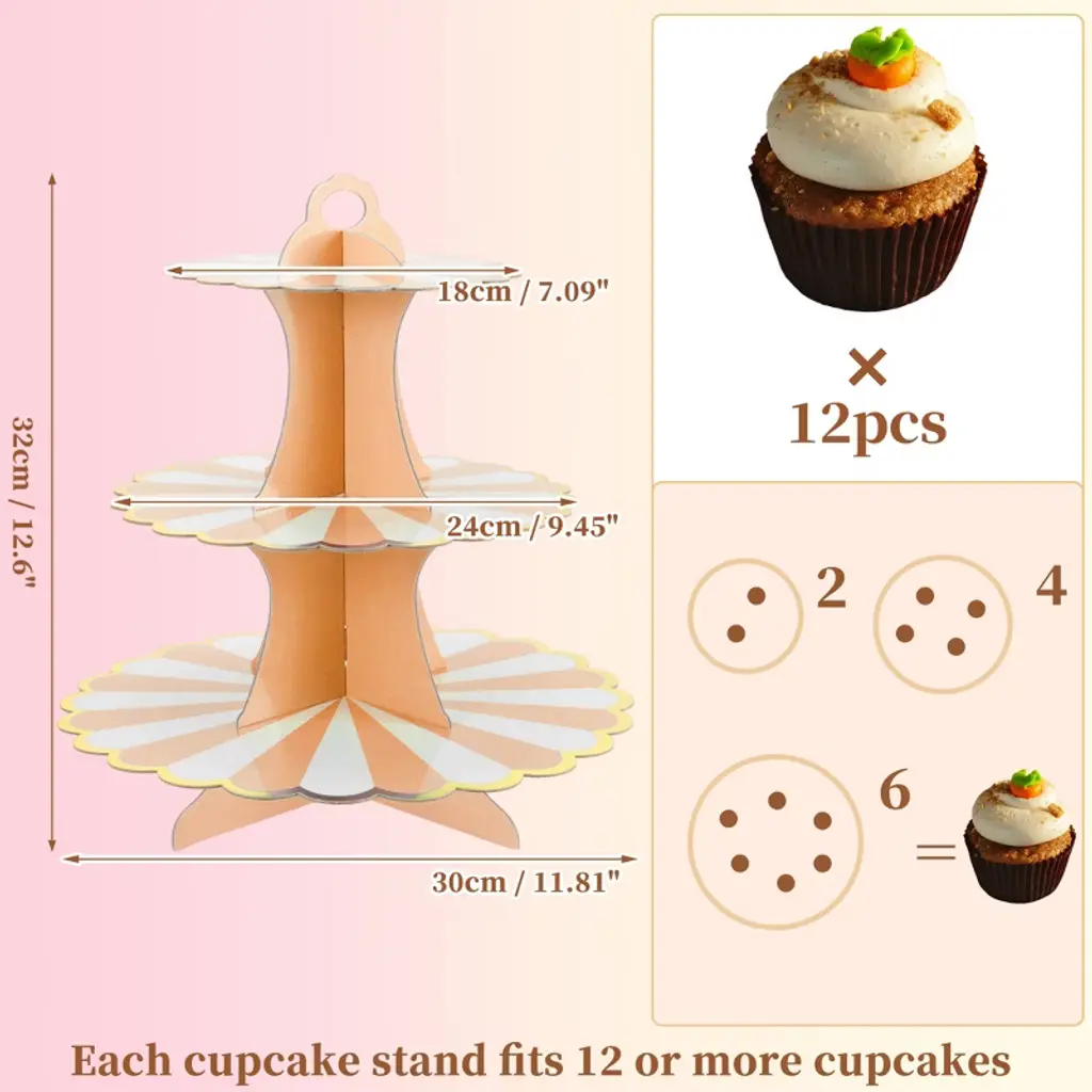 This cupcake stand offers stability and support for your desserts, crafted from durable materials to enhance the presentation of your sweet creations at events. The innovative design allows for customizable tiers, accommodating different quantities of cupcakes or treats for versatile and visually appealing displays tailored to your needs. Enjoy hassle-free setup and storage with a user-friendly design that enables quick assembly and disassembly, suitable for both personal and professional use without any complications. Elevate your dessert presentation with this decorative stand, adding sophistication to any setting and making it a charming centerpiece at weddings, parties, or everyday gatherings. Beyond cupcakes, this versatile stand can showcase muffins, pastries, fruits, and more, making it a practical and stylish addition to your kitchen or dining table for various serving needs. Specifications:Material: Cardboard. Height: 32cm / 12.6". Plate Diameter: 18cm / 7.09", 24cm / 9.45", 30cm / 11.81". Package List: 2 Pcs 3-Tier Cupcake Stand.