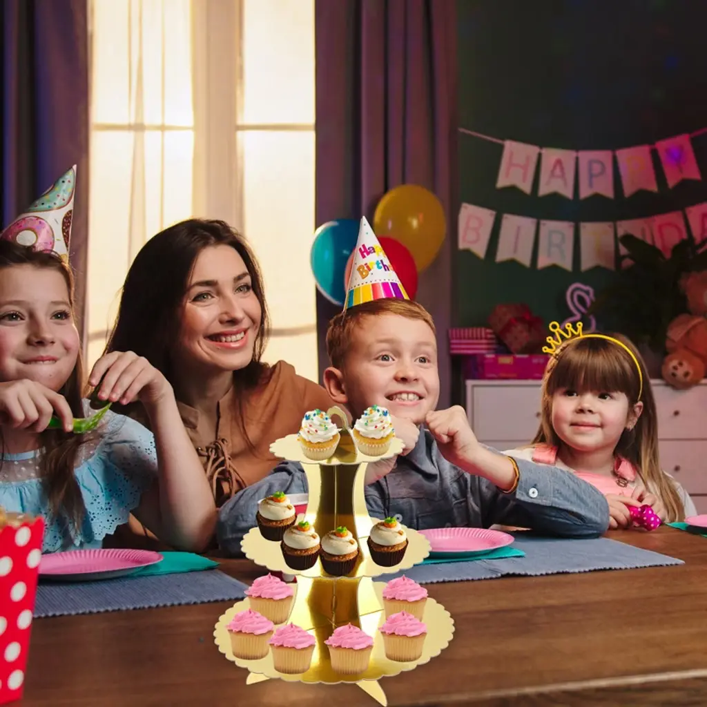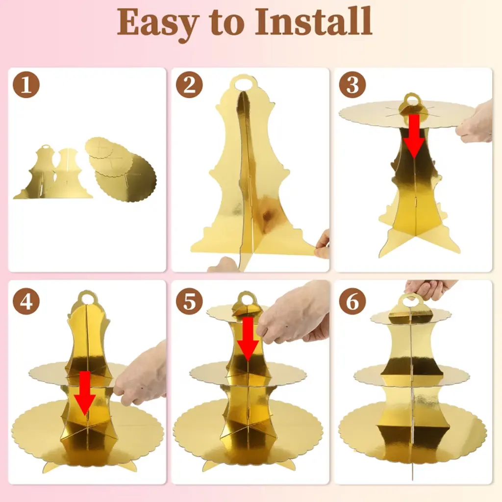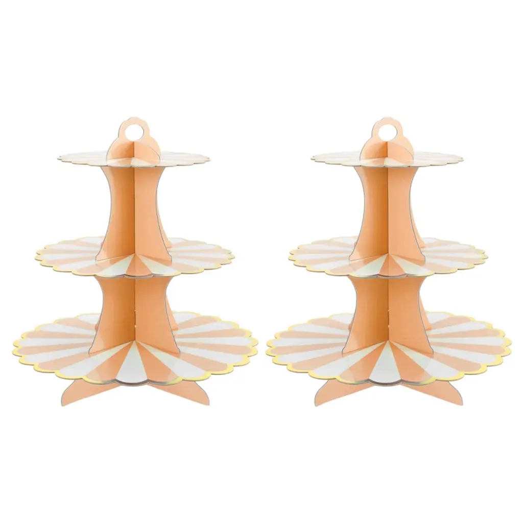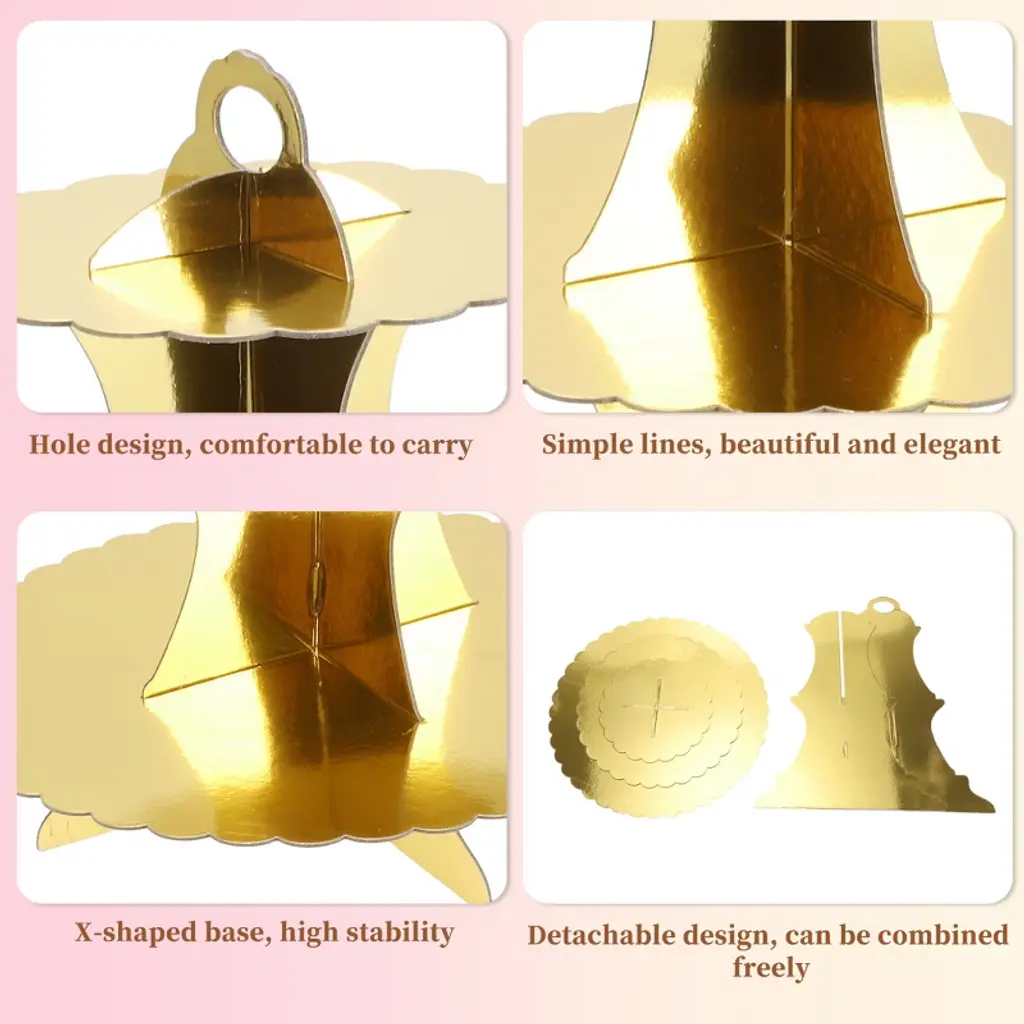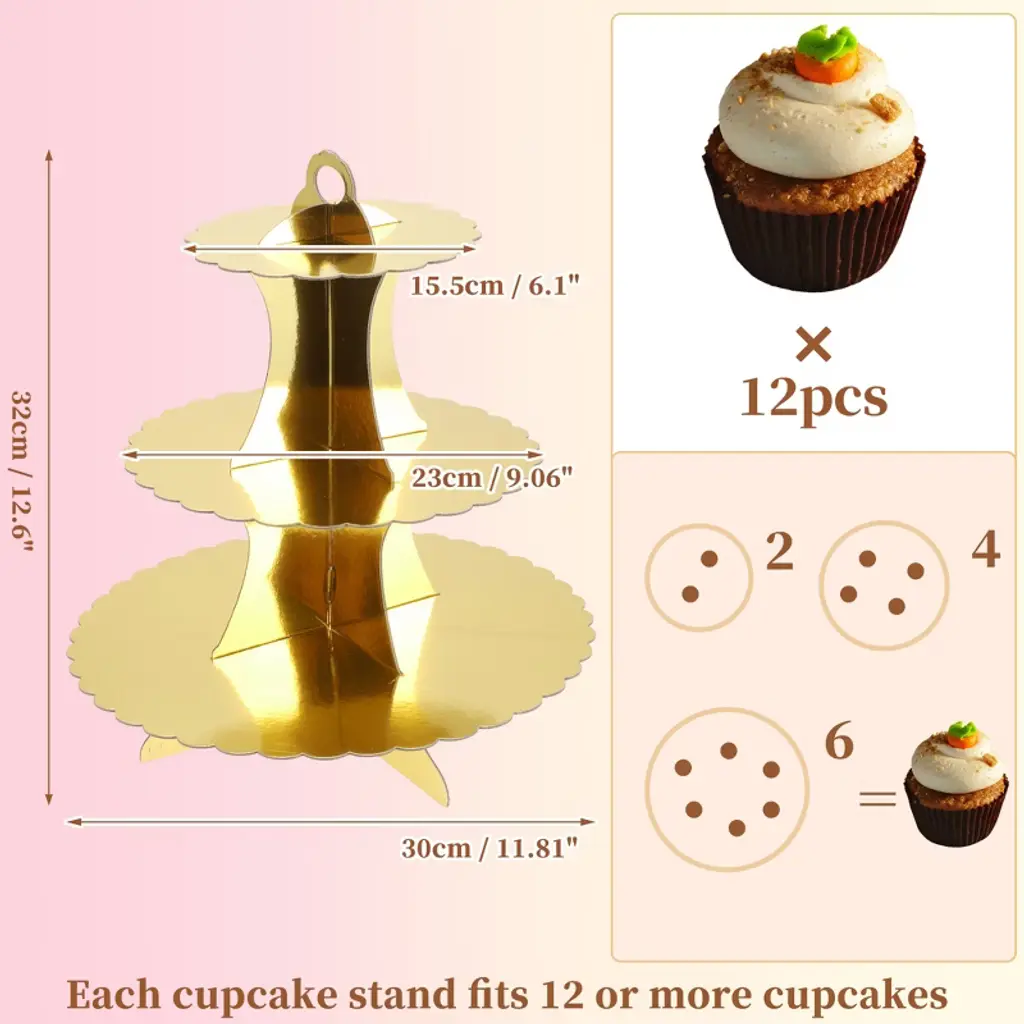 This cupcake stand offers stability and support for your desserts, crafted from durable materials to enhance the presentation of your sweet creations at events. The innovative design allows for customizable tiers, accommodating different quantities of cupcakes or treats for versatile and visually appealing displays tailored to your needs. Enjoy hassle-free setup and storage with a user-friendly design that enables quick assembly and disassembly, suitable for both personal and professional use without any complications. Elevate your dessert presentation with this decorative stand, adding sophistication to any setting and making it a charming centerpiece at weddings, parties, or everyday gatherings. Beyond cupcakes, this versatile stand can showcase muffins, pastries, fruits, and more, making it a practical and stylish addition to your kitchen or dining table for various serving needs. Specifications: Material: Cardboard. Height: 32cm / 12.6". Plate Diameter: 15.5cm / 6.1", 23cm / 9.06", 30cm / 11.81". Package List: 2 Pcs 3-Tier Cupcake Stand.
