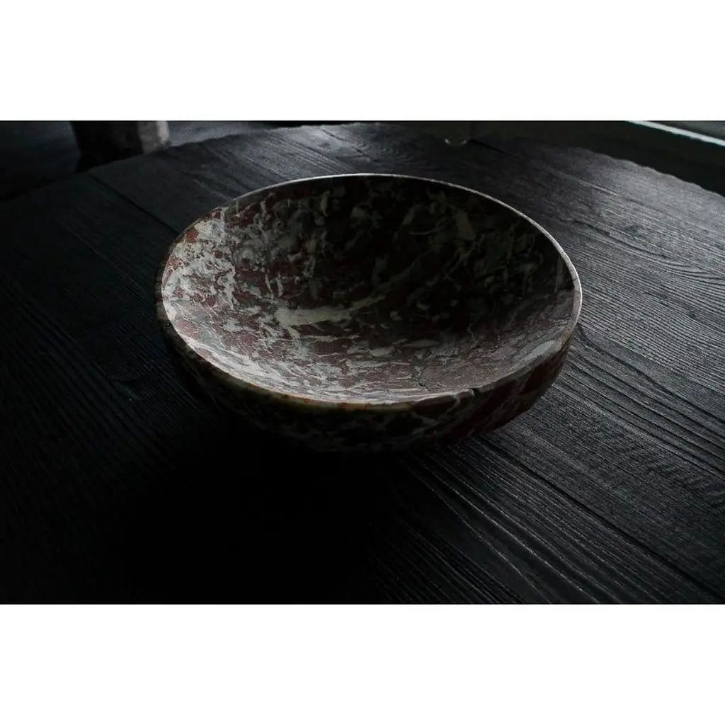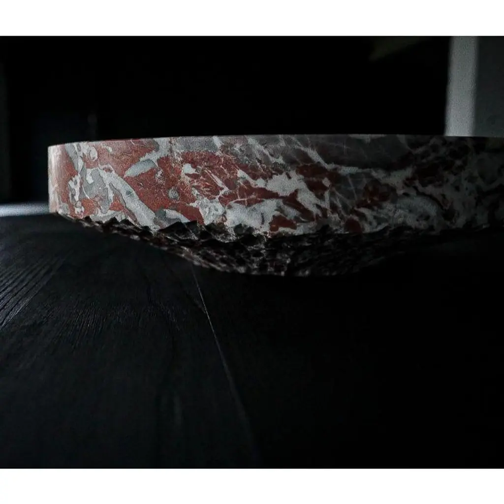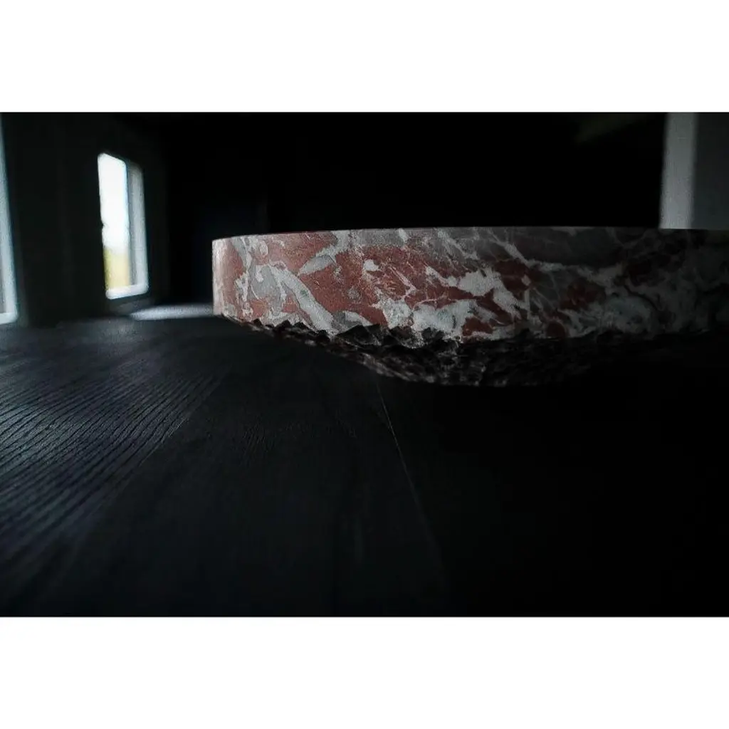 Unique Belgian royal red marble dish by Jeremy Descamps (Full Hand Cut)Unique pieceDimensions: D 40 x H 10 cmMaterials: belgian royal red marbleAlways attracted to manual trades, Jeremy Descamps went on to study as a lathe miller and made it his profession for more than ten years. It was in 2016 that he used his technical skills and his sensitivity to make his first creations, which will remain in the private sphere. It was the interest that these creations aroused in his entourage that prompted him to take the plunge and embark on the LFN adventure. He, therefore, embarked on the creation of tailor-made furniture for private and professional alike. This has enabled him to have nice collaborations such as the one with the Hors Champs restaurant. He also creates an annual collection, ORIGIN, made up of a range of home accessories, produced in very small series. Today LFN is evolving. Custom-made creations give way to total and unconstrained creation in the world of fine art furniture. He decides to present his creations made of wood only under the "Shu sugi ban" technique to mark his identity, his DNA, his black country in deep black (= Charleroi) He learns the previous gestures to cut and shape stone, a material he is particularly fond of. Supported by the benevolence of a former stonemason well known in Belgian quarries, it is the energy of the past that resurfaces in his creations Brass makes its entry, as well as copper. Jeremy is an artist whose main concern is to share, provide emotions, give meaning to objects, sublimate shades of black, textures. He meets people, in particular that of Caroline NOTTE, an architect whose presentations are no longer to be made. From this meeting was born a collaboration since she offered to exhibit two creations in his famous house designed by Louis Herman De Koninck. A great introduction to the world of fine art furniture, as well as the various requests from the famous VILLAS magazine to appear in their issues.