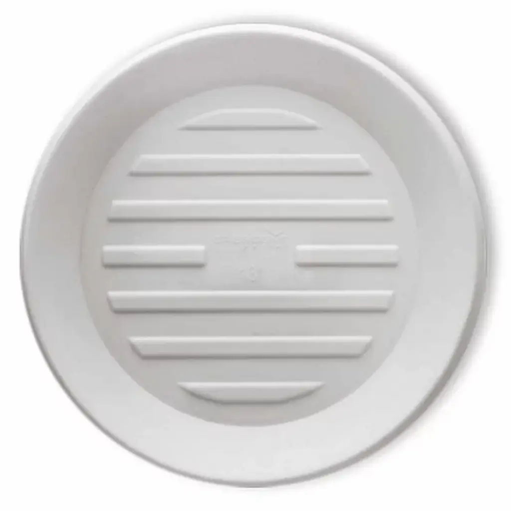 The Crescent Garden Universal Round Indoor/Outdoor Plant Saucer keeps things clean and dry around a round-bottomed planter without distracting from its smooth, clean lines. It is made out of rotation molded polymer resin, in a wide range of colors and sizes to accommodate planters with the same size and shape base.