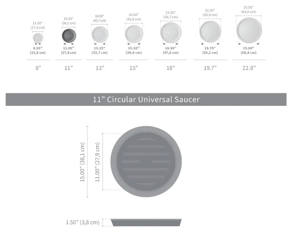 Coordinate your round-base planter with the perfect color and size of our round plant saucers, designed for durability to withstand the weight of heavy pots while protecting your surfaces from water damage and dirt. Crafted with weather-safe materials, these saucers are UV stabilized to ensure they remain fade-free and long-lasting, even when used outdoors. Ideal for both indoor and outdoor use, these aesthetically pleasing saucers seamlessly blend with any d�cor and are compatible with existing containers. Enhance your planting experience with our round plant saucers, ensuring your surfaces remain pristine while adding a touch of elegance to your gardening setup. Comes with a 10-year warranty for peace of mind.