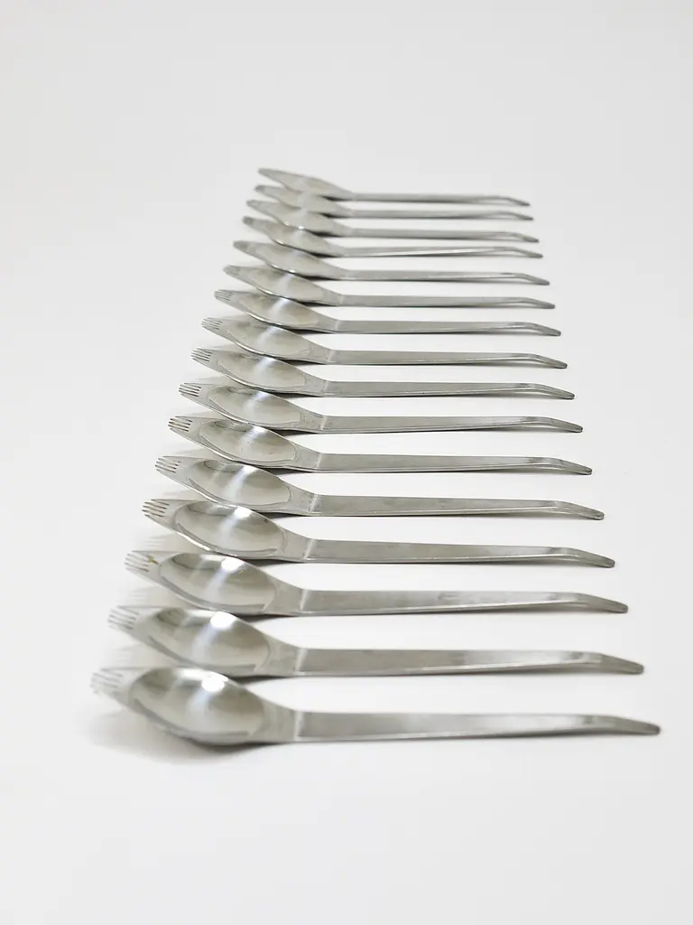 Up to 7 identical party sporks (a smart combination of a spoon and a fork) from the 1960s. Model „Göffel“, award-winning design by Ernst Otto Loewe and K.H. Hoelscher, executed by Amboss Austria. High-quality cutlery, made of polished and brushed 18/18 stainless steel. Length: 7 1/4 inches. Fully marked, in good condition, with marginal signs of wear. 7 pieces available, sold and priced per piece.