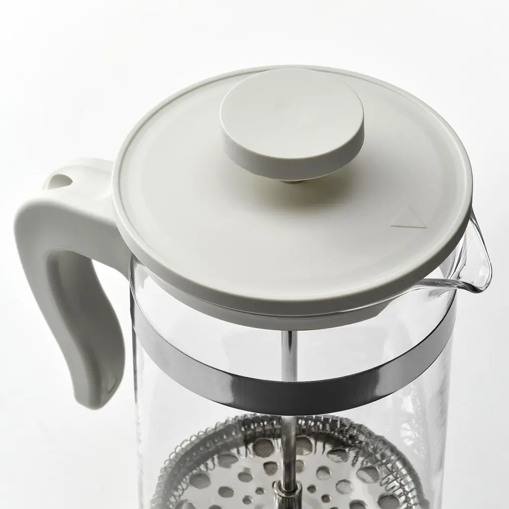 UPPHETTA French press coffee maker - glass/stainless steel off-white 34 oz. Pour hot water over ground coffee beans or tea leaves, push down the strainer and serve straight from the French press coffee maker. Can be taken apart for easy cleaning. Wash this product before using it for the first time.