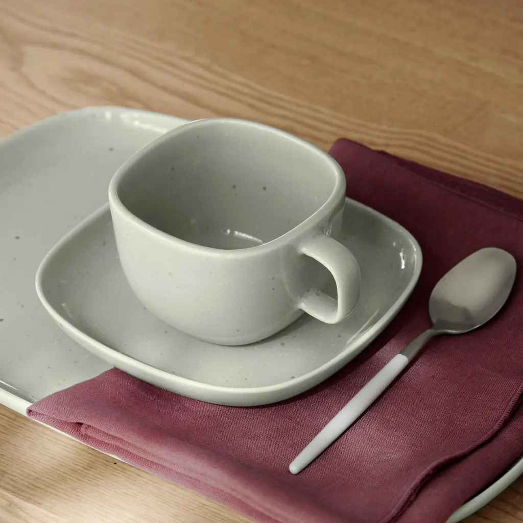 Oval saucer with extra landing room—spoon, sugar, small bite. Designed by Sebastian Herkner for Blomus, VAHLO pares tableware back to soft curves and easy edges. The cup sits low and comfortable in the hand; the saucer’s elongated shape steers drips and gives space for a biscuit or tea bag. Up close you’ll see the glaze: a fine, natural speckle that varies slightly from piece to piece. It’s the quiet character that makes stoneware feel lived-in from day one—morning coffee, afternoon tea, late-night cocoa. Set of two cups with two saucers. Stackable, sturdy, weekday-ready. Pull them from the shelf when friends drop by, or keep a pair by the machine for the daily ritual.