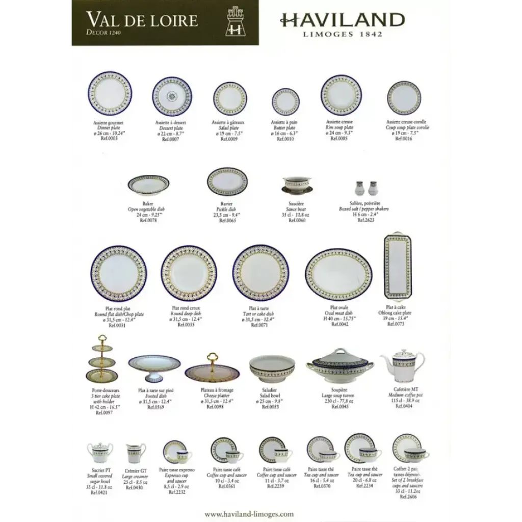 France's Loire valley is well known for it's beautiful flora. Lavender flowers are especially abundant. Haviland captures the essence of lavender flowers with the Val de Loire dinnerware. Tiny blue flowers adorn each piece, along with delicate designs and a gold rim. Five piece place setting includes dinner plate, salad/dessert plate, bread & butter plate, teacup and saucer. Haviland Porcelain was founded by David Haviland, an American who moved from New York to France after he was brought a broken tea cup to match and recognized the quality and color of the old piece of porcelain. Filled with curiosity, he went to France to find the factory where the cup had been made, but the samples he was sent were not up to his standards. So in 1841, he moved to Limoges to set up his own factory. Traditional French dinnerware was usually produced in Limoges and sent to Paris for decoration. Haviland insisted on setting up a studio within his factory to have more control over the designs. Renowned artists, including Cocteau, Dali, and Kandinsky have played a role in the company's designs. Today, Haviland is one of the premier names in French porcelain dinnerware, sought by collectors all over the world. Clients have included the White House, Empress Eugenie, General de Gaulle, Jacques Chirac, the Emperor of Japan, and the Royal Court of Morocco.