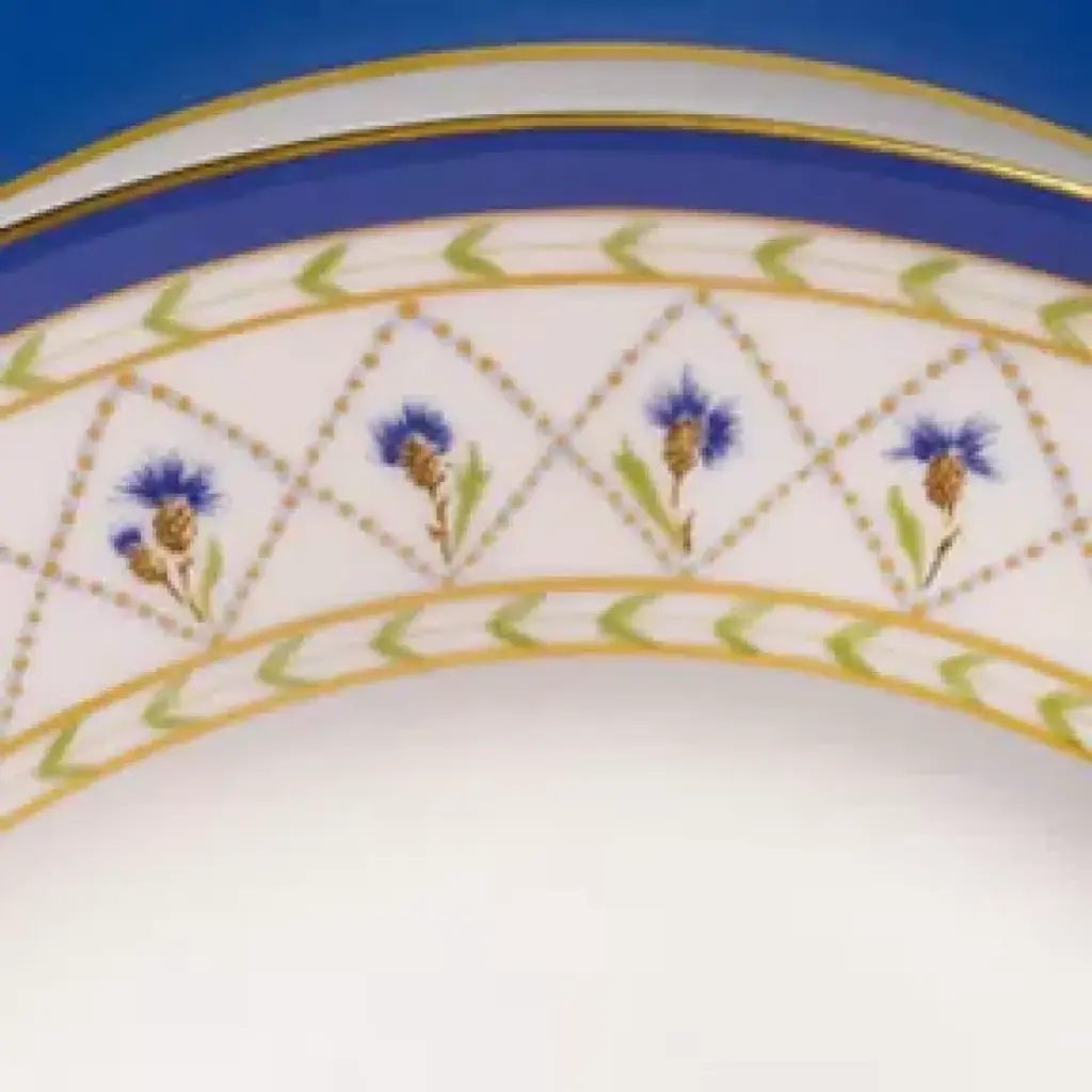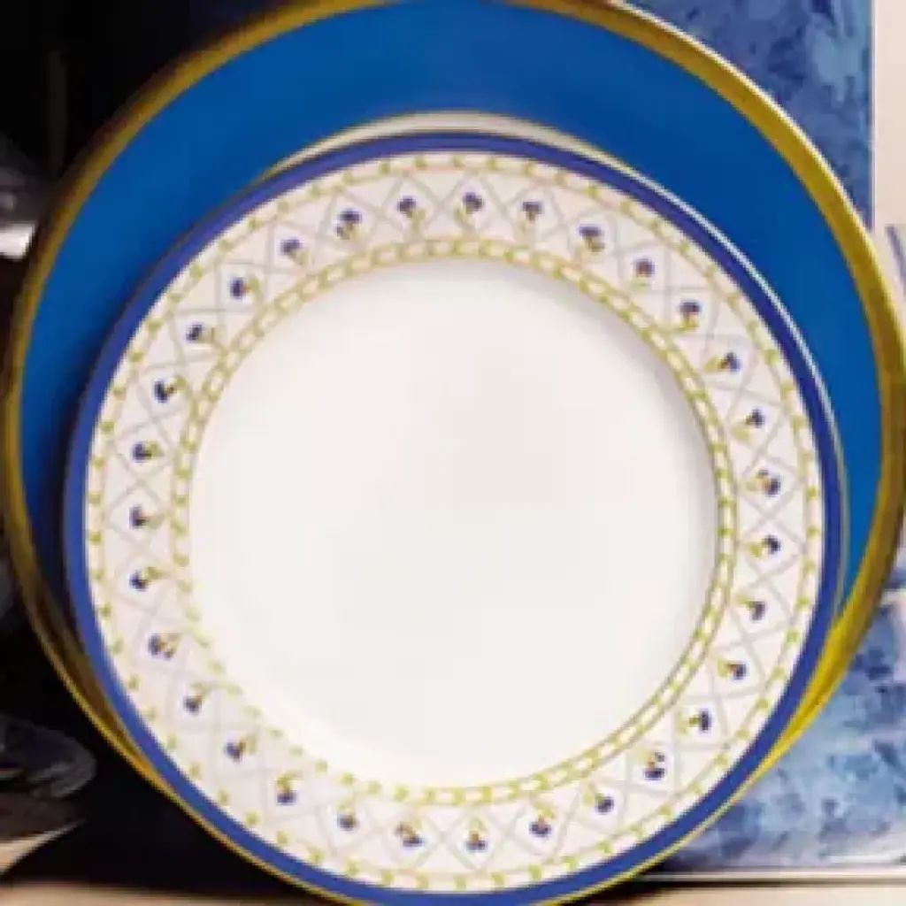 France's Loire valley is well known for it's beautiful flora. Lavender flowers are especially abundant. Haviland captures the essence of lavender flowers with the Val de Loire dinnerware. Tiny blue flowers adorn each piece, along with delicate designs and a gold rim. Five piece place setting includes dinner plate, salad/dessert plate, bread & butter plate, teacup and saucer. Haviland Porcelain was founded by David Haviland, an American who moved from New York to France after he was brought a broken tea cup to match and recognized the quality and color of the old piece of porcelain. Filled with curiosity, he went to France to find the factory where the cup had been made, but the samples he was sent were not up to his standards. So in 1841, he moved to Limoges to set up his own factory. Traditional French dinnerware was usually produced in Limoges and sent to Paris for decoration. Haviland insisted on setting up a studio within his factory to have more control over the designs. Renowned artists, including Cocteau, Dali, and Kandinsky have played a role in the company's designs. Today, Haviland is one of the premier names in French porcelain dinnerware, sought by collectors all over the world. Clients have included the White House, Empress Eugenie, General de Gaulle, Jacques Chirac, the Emperor of Japan, and the Royal Court of Morocco.