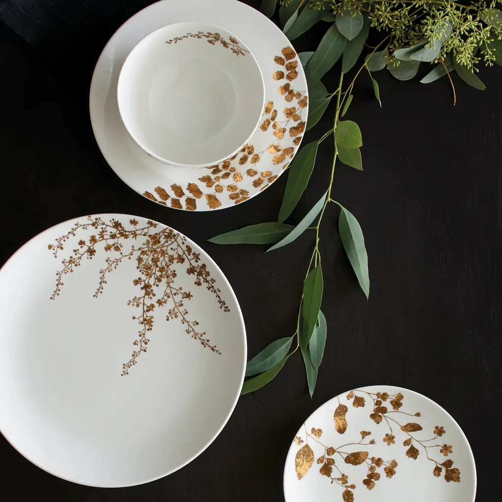 A coupe shape service decorated with golden leaves that seems to be brought to life by a subtle variation of nature in each piece. Vegetal Gold can stand alone or be accented with Diamond, Gold or Palmyre.