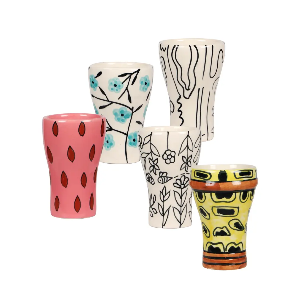 The Velma Ceramic Glassware Collection brings a playful twist to your table with cheeky designs like 'Flirty', 'Daydreamer', 'Goofy', 'Bashful', and 'Sultry'. Hand-painted by skilled ceramic artisans, each piece is food-safe and full of personality. Available as a set of four with your favorite face or a set of five featuring one of each, these ceramic gems are as fun as they are functional.