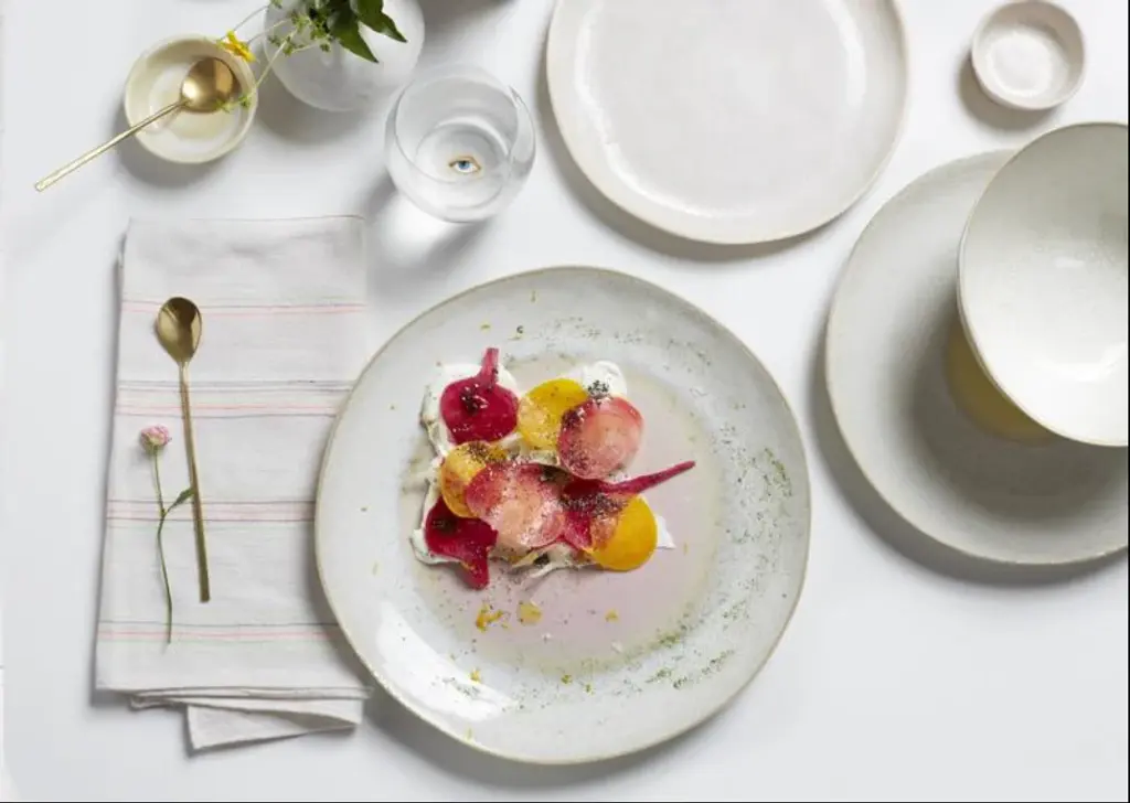 Fusing Eastern and Western styles, philosophies, and techniques, stoneware ceramics are crafted in Thailand. Warm desert hues fade outward from the center, playing with light and shadows to evoke an air of mysticism.