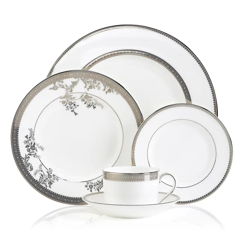 Inspired by luxurious details from Vera Wang's bridal gowns, the Vera Lace collection is characterized by understated elegance. Decorated with a refined pattern that weaves together a unique combination of tailored platinum lace bands and delicate floral details, Vera Lace brings elegance and grace to any dining occasion