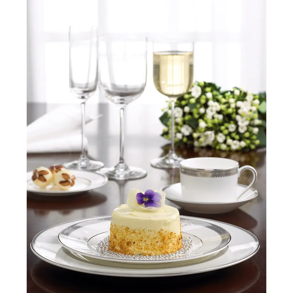 Inspired by luxurious details from Vera Wang's bridal gowns, the Vera Lace collection is characterized by understated elegance. Decorated with a refined pattern that weaves together a unique combination of tailored platinum lace bands and delicate floral details, Vera Lace brings elegance and grace to any dining occasion