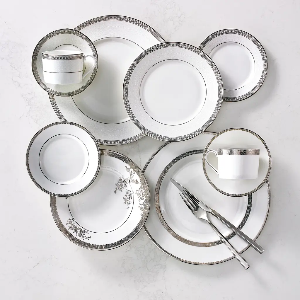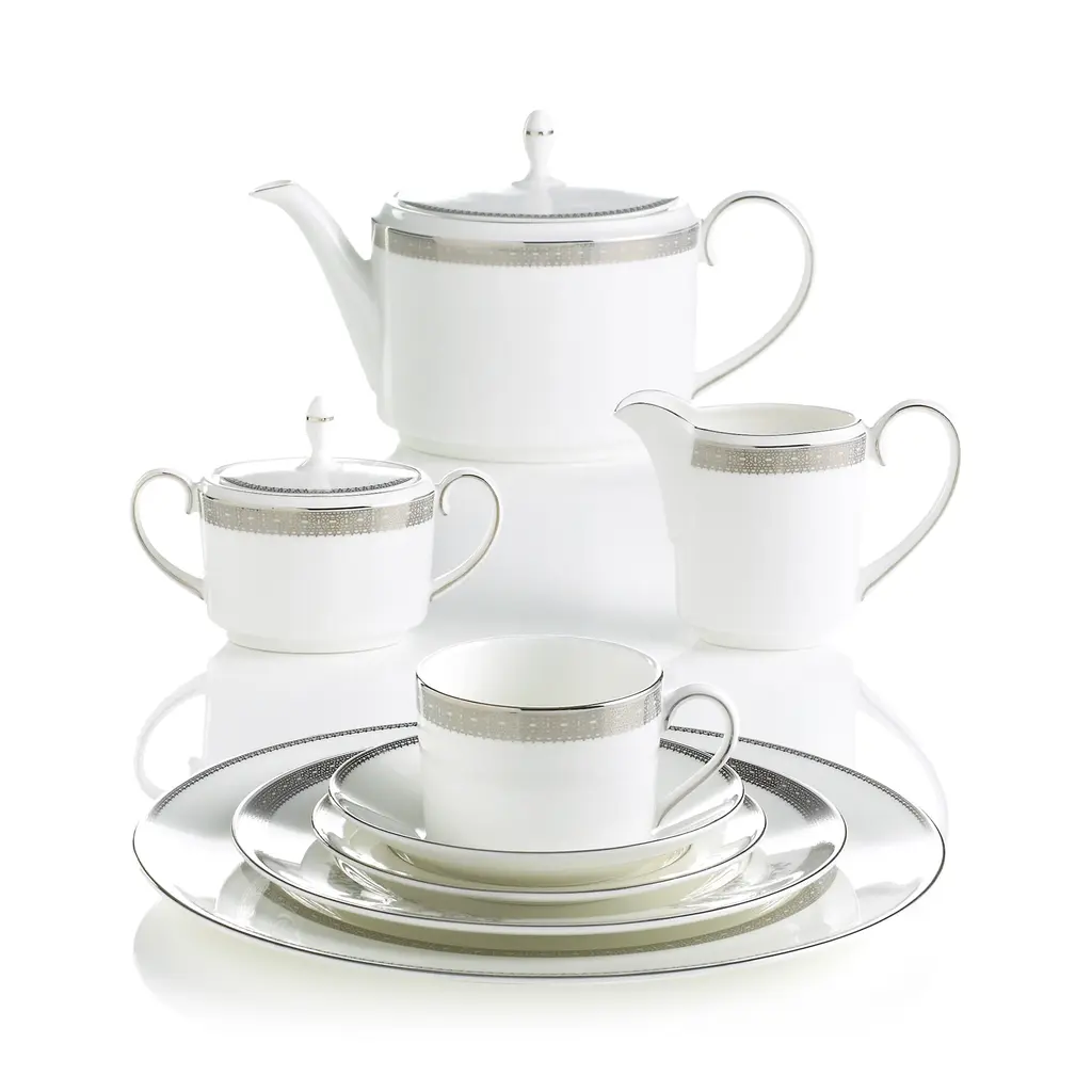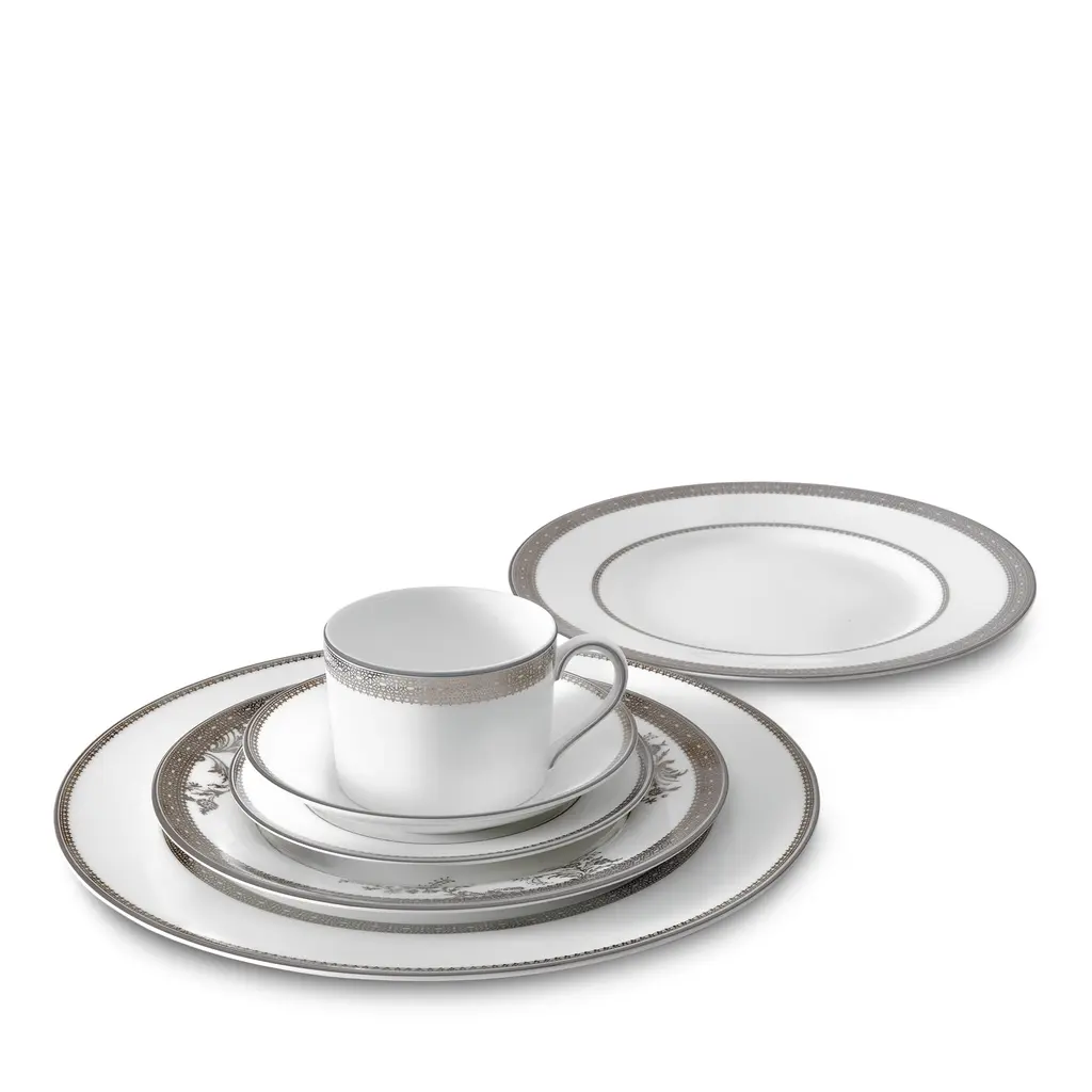 Inspired by luxurious details from Vera Wang's bridal gowns, the Vera Lace collection is characterized by understated elegance. Decorated with a refined pattern that weaves together a unique combination of tailored platinum lace bands and delicate floral details, Vera Lace brings elegance and grace to any dining occasion