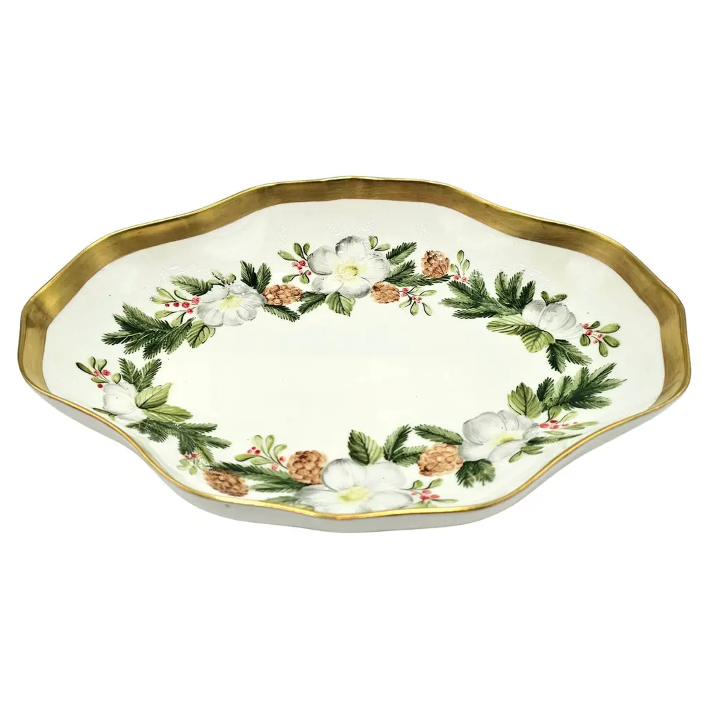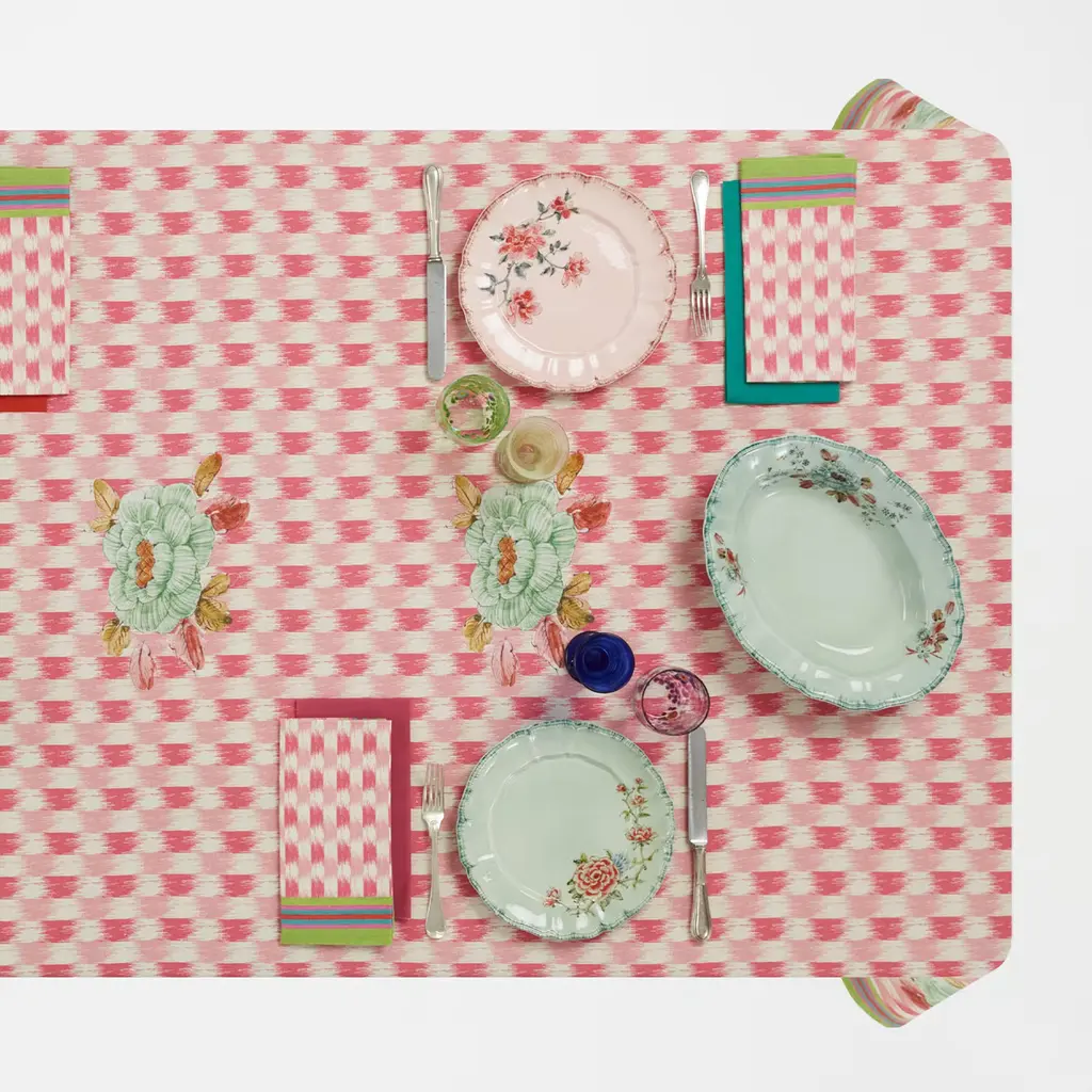 This collection, which was born within a capsule of ceramics and home textiles created in collaboration with Lisa Corti, combines the history and imagery of two worlds in a fresh and versatile palette. The shaped form emphasizes the romantic theme, while the fringed, hand-painted edge recalls traditional ikat textile prints.