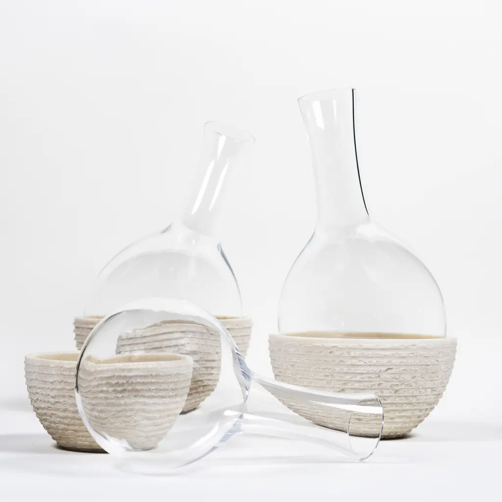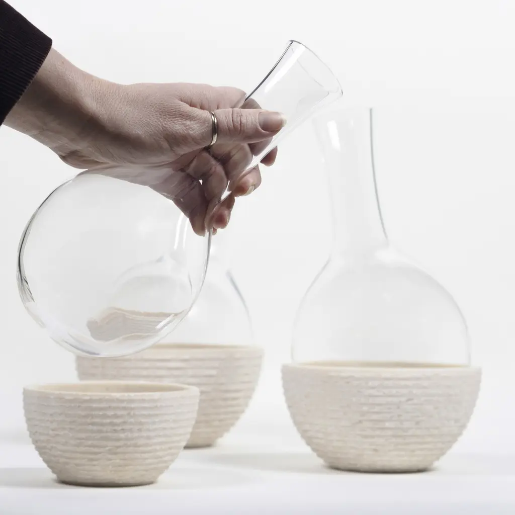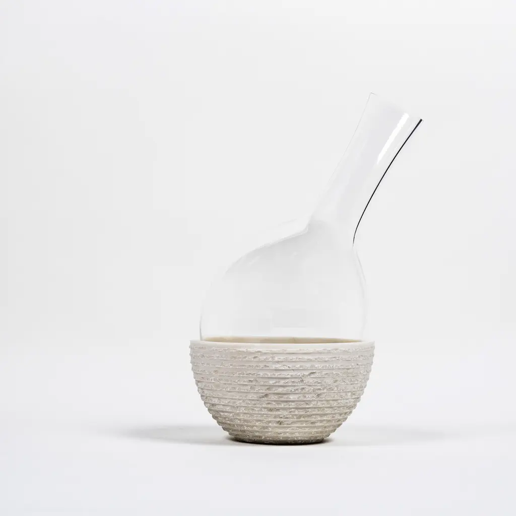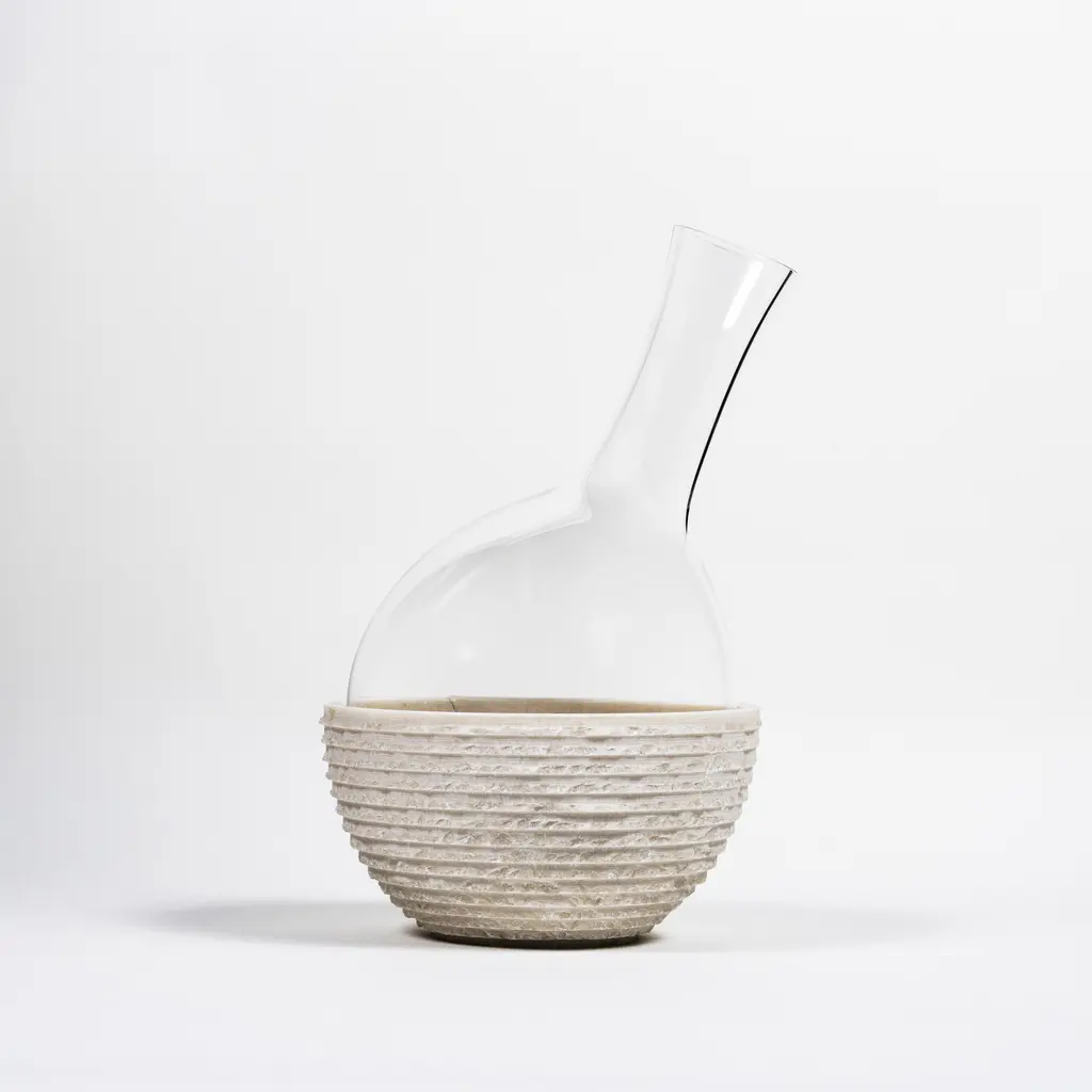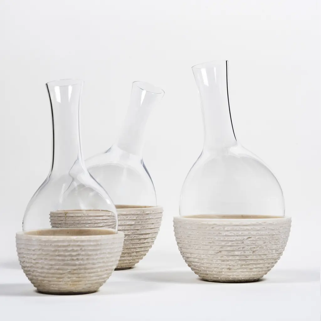 Versante explores the idea of drops of water that over time can pierce through stone. Italian studio Gumdesign has created the design with two refined materials: Segesta Ivory Sicilian marble and crystal glass. The solidity of stone becomes even more pronounced thanks to a circular line pattern that gives an elegant tactility to the bowl-like base. The crystal vessels have spherical shapes that fit into the stone bases perfectly. Whether placed upright or in the intended, slightly angled position, the glass bottles provide an elegant way to serve anything from water to wine at the dining table. The Versante series comprises bottles in three sizes ranging from 0.5l to 1.5l.