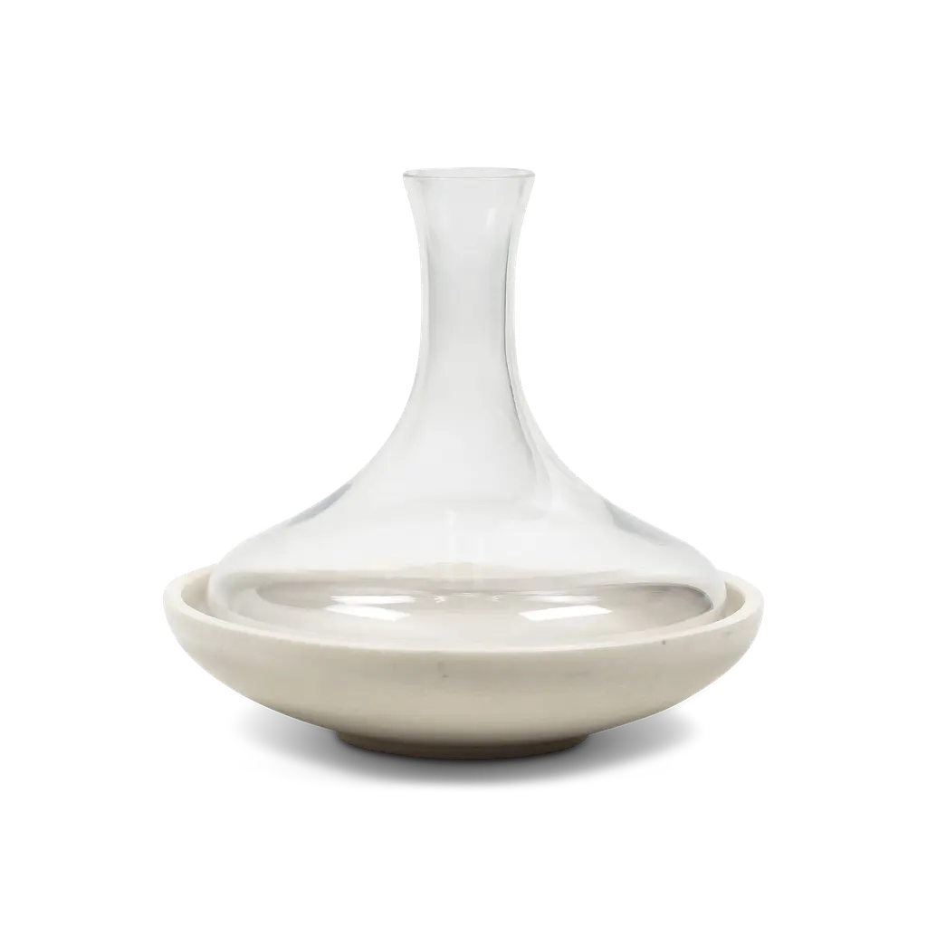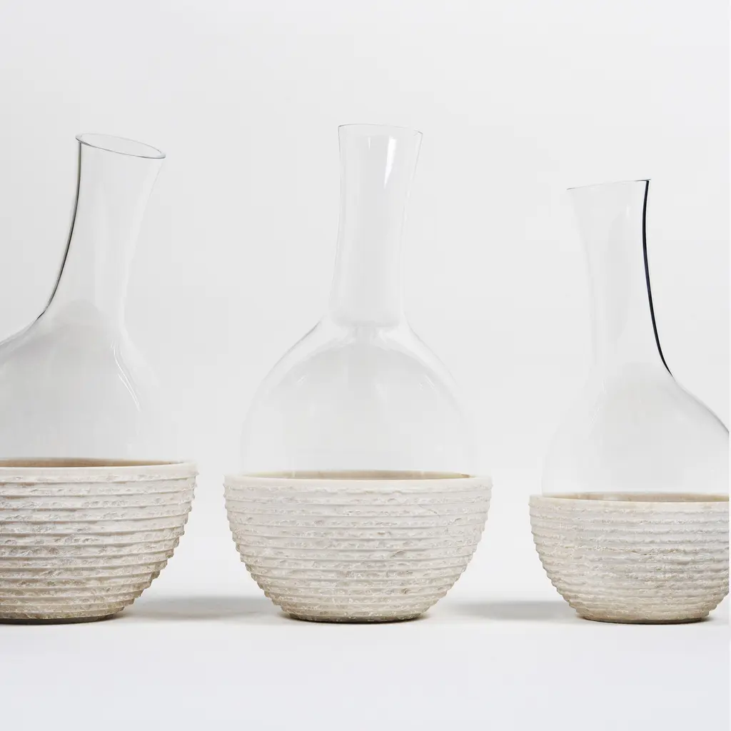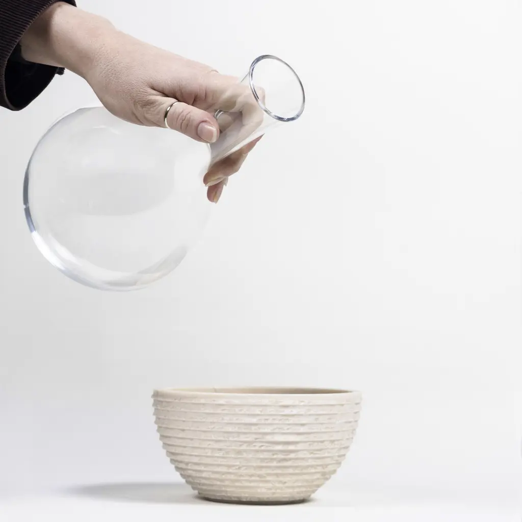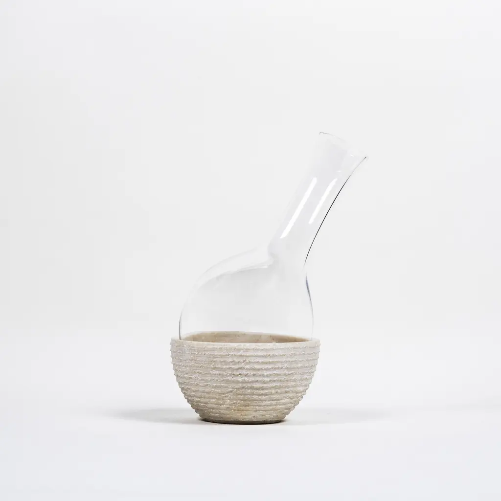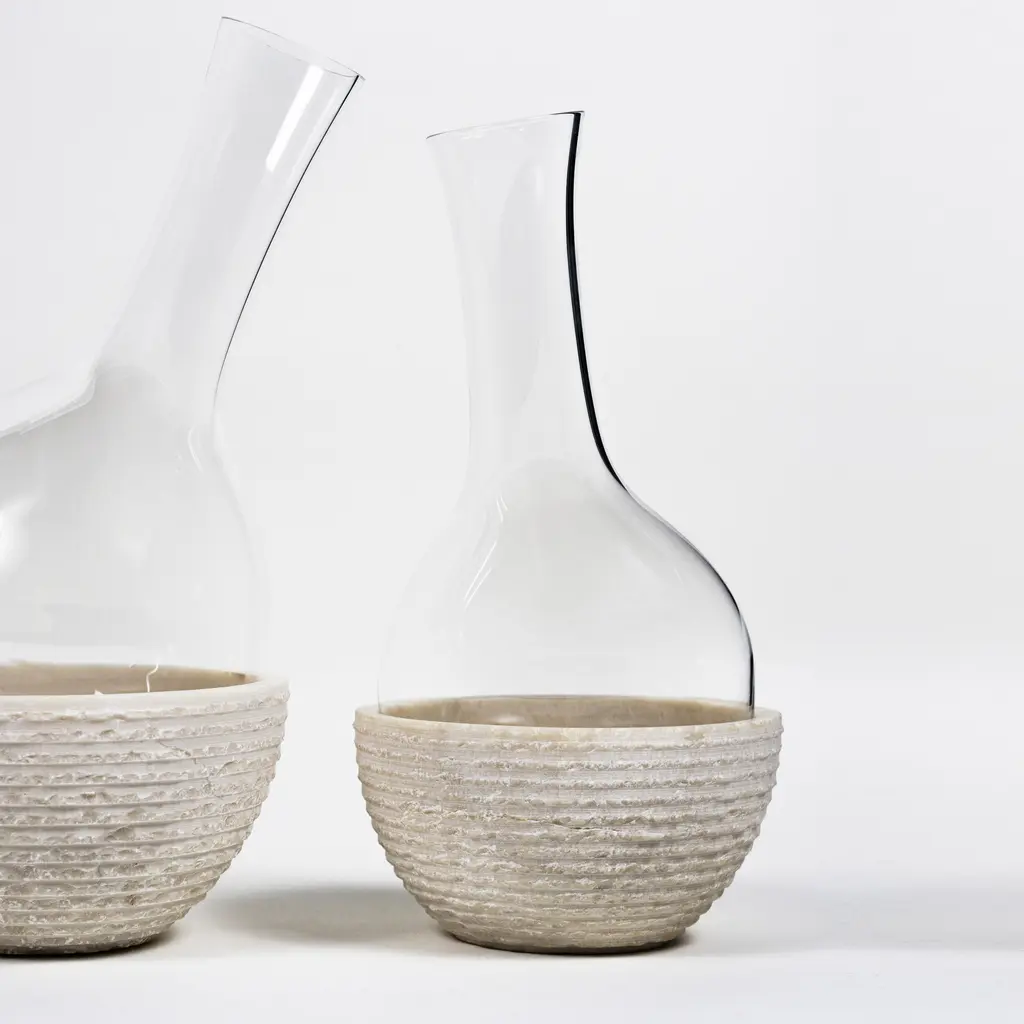 Versante explores the idea of drops of water that over time can pierce through stone. Italian studio Gumdesign has created the design with two refined materials: Segesta Ivory Sicilian marble and crystal glass. The solidity of stone becomes even more pronounced thanks to a circular line pattern that gives an elegant tactility to the bowl-like base. The crystal vessels have spherical shapes that fit into the stone bases perfectly. Whether placed upright or in the intended, slightly angled position, the glass bottles provide an elegant way to serve anything from water to wine at the dining table. The Versante series comprises bottles in three sizes ranging from 0.5l to 1.5l.