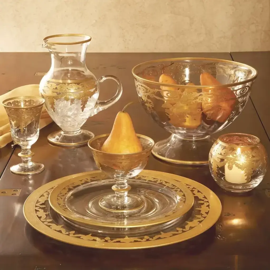Artisans outside of Florence, beautifully combine luxurious materials, intricate detail and subtle touches. This piece is hand-etch and painted with 24-karat gold highlights. Italian glass, Hand made in Italy. As seen in Downtown Abbey: A New Era. Founded in 1997 by Ann Skidmore, Arte Italica is a story of one woman's passion for Italian history, culture, art, and vintage pewter. Today, Arte Italica is one of the leading importers of European tabletop and home accessories products in the United States. Every piece is handmade and designed so that they can easily be mixed and matched to create a timeless, classic, and effortless look.