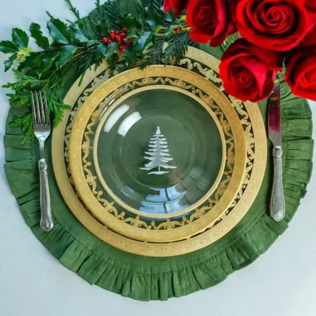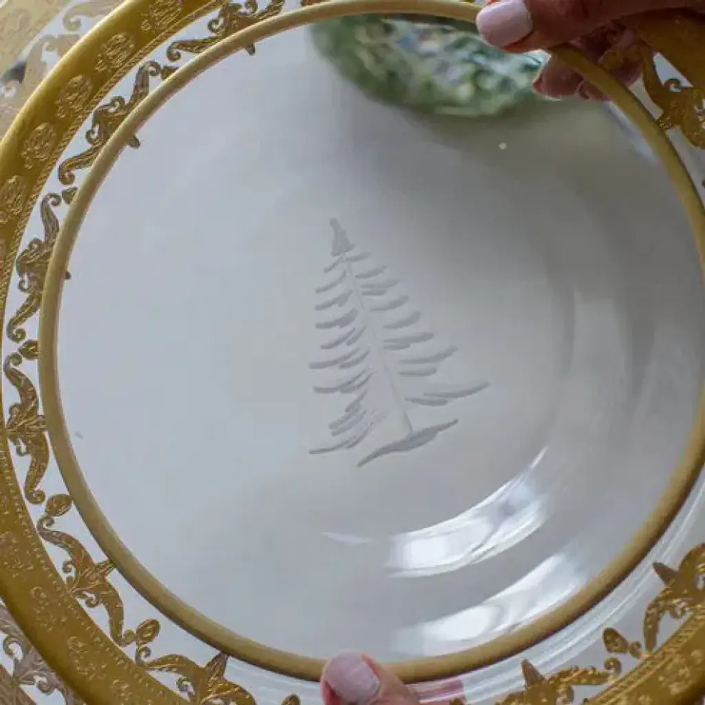 This stunning holiday salad plate brings Winter beauty to any table setting, especially our Vetro Gold table settings. This plate features an etched fir tree with a Gold border. Founded in 1997 by Ann Skidmore, Arte Italica is a story of one woman's passion for Italian history, culture, art, and vintage pewter. Today, Arte Italica is one of the leading importers of European tabletop and home accessories products in the United States. Every piece is handmade and designed so that they can easily be mixed and matched to create a timeless, classic, and effortless look.