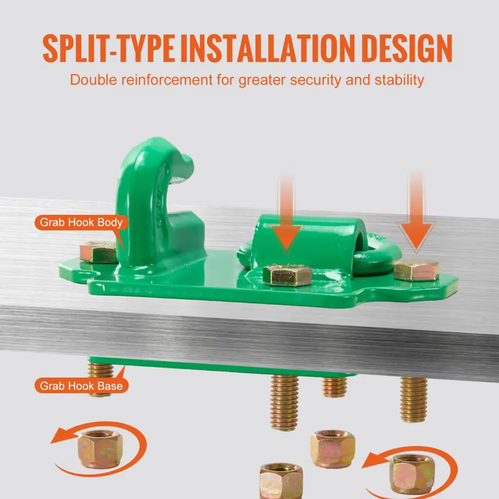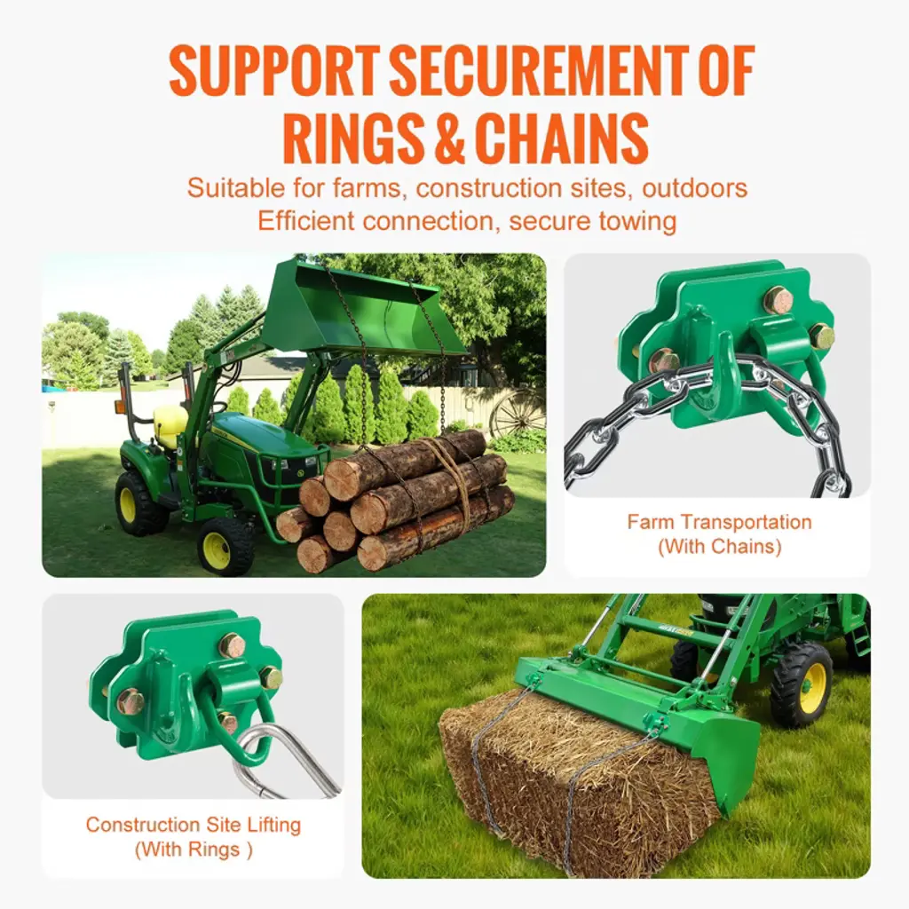 Feature: High Load Capacity: The tractor bucket hooks are constructed from G70-grade steel, providing exceptional strength and durability. With a maximum load capacity of 15,000 lbs, it offers a broad towing range and can accommodate various sizes, weights, and shapes of towed objects. This design ensures that towing tasks can be completed quickly and easily, making it an ideal choice for both agricultural and industrial applications. Easy Installation: The tractor grab hooks are compatible with 3/8" chains and fit most vehicles, including agricultural vehicles, tractor bucket, and off-road vehicles. It can be easily assembled and disassembled, allowing for convenient use without the need for drilling or external tools. The installation process consists of just four simple steps, making it user-friendly and efficient for everyone. Flexible & Efficient: This bolt on grab hook supports multiple applications, allowing users to choose between standalone towing or using it in combination with chains and shackles. By increasing towing length or stabilizing loads, it effectively addresses complex terrains, thereby enhancing overall work efficiency. This versatility ensures that it can adapt to various situations and requirements, making it an essential tool for a wide range of tasks. Durable & Reliable: The tractor hooks feature precise structural connections and secured with a dual-thick base to ensure stability during towing operations. The surface is coated with green powder for enhanced protection, making it rust-resistant and capable of withstanding harsh weather conditions. This robust design extends its lifespan, ensuring long-term reliability in demanding environments. Versatile Applications: The bolt on grab hook is widely applicable in heavy-duty operations across agriculture, industry, and construction. It is idea for lifting and moving heavy objects on farms and outdoor yards, as well as for transporting building materials at construction sites. This versatility makes it an excellent attachment for tractor buckets, enhancing productivity in various tasks. Package Content 2 x Tractor Bucket Hooks