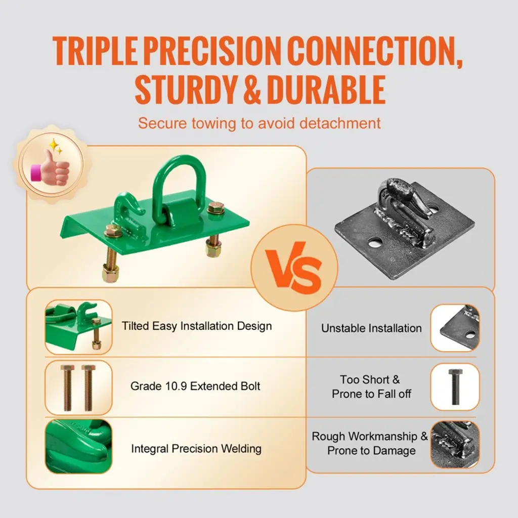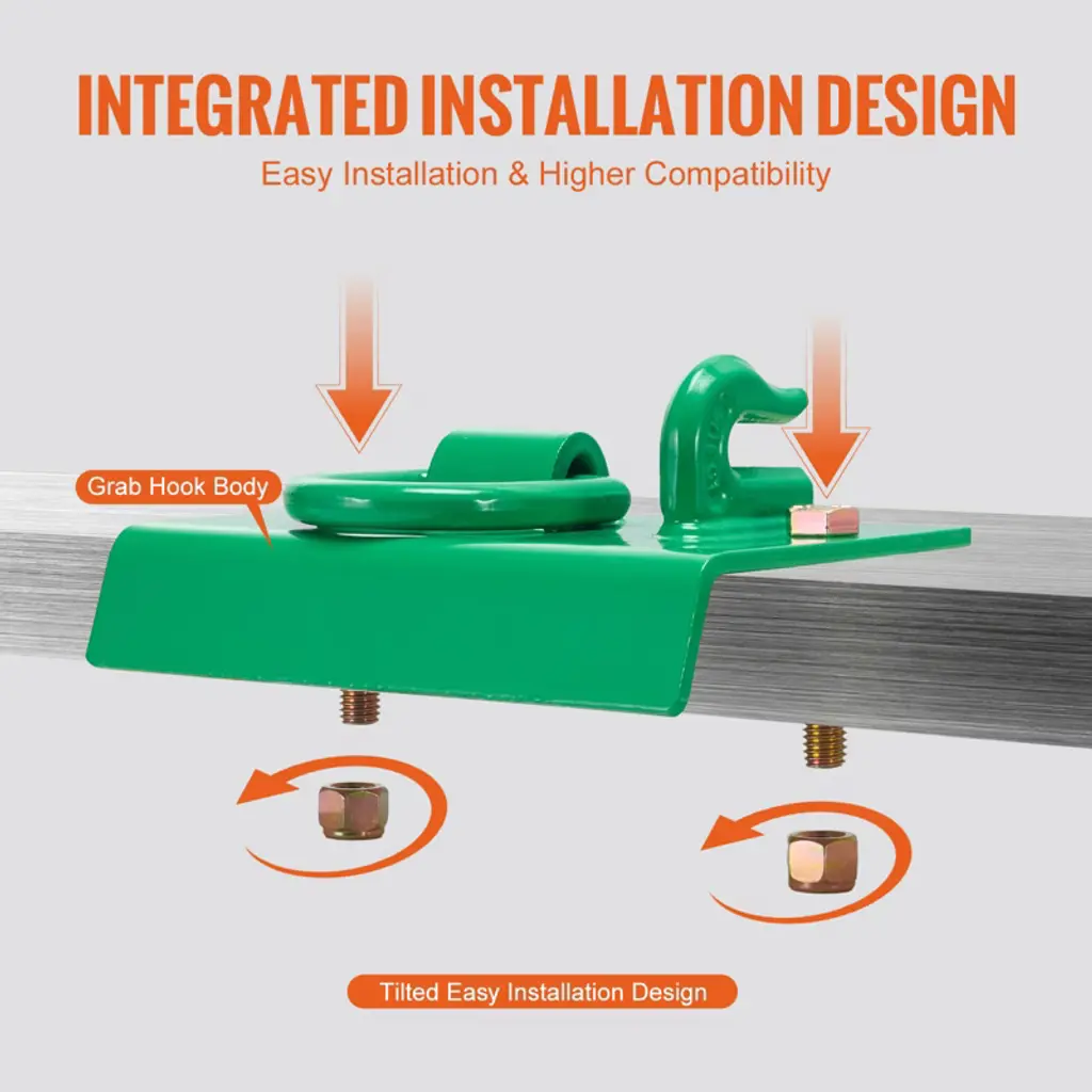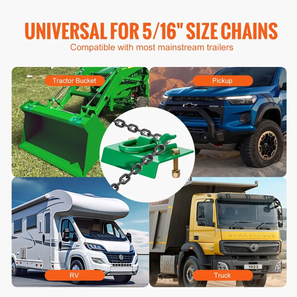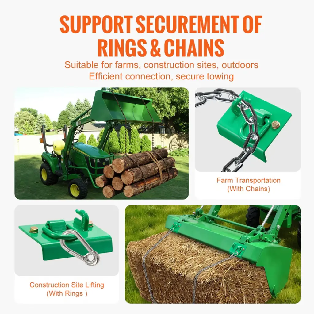 Feature: High Load Capacity: The tractor bucket hooks are made from G70-grade steel, providing high strength and wear resistance, with a maximum load capacity of 12,000 lbs. It has a wide towing range and can accommodate various sizes, weights, and shapes of towed objects, making it easy and quick to complete towing tasks. Easy Installation: The tractor grab hook is compatible with 5/16" chains, making it suitable for most vehicles, including agricultural vehicle, tractor bucket, and off-road vehicle. It can be easily disassembled and reassembled for repeated use, allowing for a convenient installation process. There is no need for drilling or external tools, just four simple steps are all it takes to complete the setup effortlessly. Flexible & Efficient: This tractor bucket grab hook supports various applications, allowing users to choose between standalone towing or using it in combination with chains and shackles. By increasing towing length or stabilizing loads, it effectively navigates complex terrains, enhancing overall work efficiency. This adaptability makes it a valuable tool for diverse tasks. Durable & Reliable: The tractor hooks feature precise structural connections and is securely fixed with a dual-thick base to ensure stability during towing operations. The surface is coated with green powder for enhanced protection, making it rust-resistant and capable of withstanding harsh weather conditions, thus extending its lifespan and ensuring long-term reliability. Versatile Applications: The bolt on grab hook is widely applicable in heavy-duty operations across agriculture, industry, and construction. It is idea for lifting and moving heavy objects on farms and outdoor yards, as well as for transporting building materials at construction sites. This versatility makes it an excellent attachment for tractor buckets, enhancing productivity in various tasks. Package Content 2 x Tractor Bucket Hooks