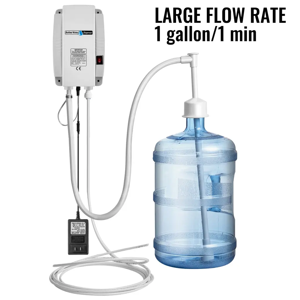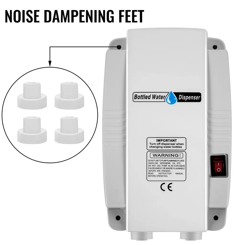BOTTLE WATER PUMP SYSTEM - All the parts in contact with liquid are made of food-grade material. This type of 110V water pump can provide power for 3-6 gallon plastic bottles.The water pump dispenser can pump up to one gallon of water maximally, The Built-in check valve prevents backflow and Thermal protection. RUBBER FEET FOR LESS NOISE -The bottle water pump is equipped with noise dampening rubber feet to minimize noise pollution, which can protect your ears from damage and provide you with a quiet environment. We recommend that you use four screws to screw it onto a wall to make it even quieter and reduce vibration. SAFETY TO USE - Pump with Illuminated on/off switch, provides clear visibility in dark or hard-to-reach places. This dispensing pump system with 40 PSI (2. 8 bar) maximum pressure, and pump will shut off when bottle is empty. EASY TO INSTALL - Quick connect port speeds installation and replacement of suction and discharge tubing. Compact size for easy mounting. Four mounting holes help to install as you need. WIDE APPLICATION - Our water pump dispenser will deliver the water into the inlet of a refrigerator for the ice-maker and chilled drinking water tap. It is perfect for coffee/tea machines, water dispensers, refrigerators, ice makers, and anywhere else, on-demand water supply is needed. It can meet all your needs.