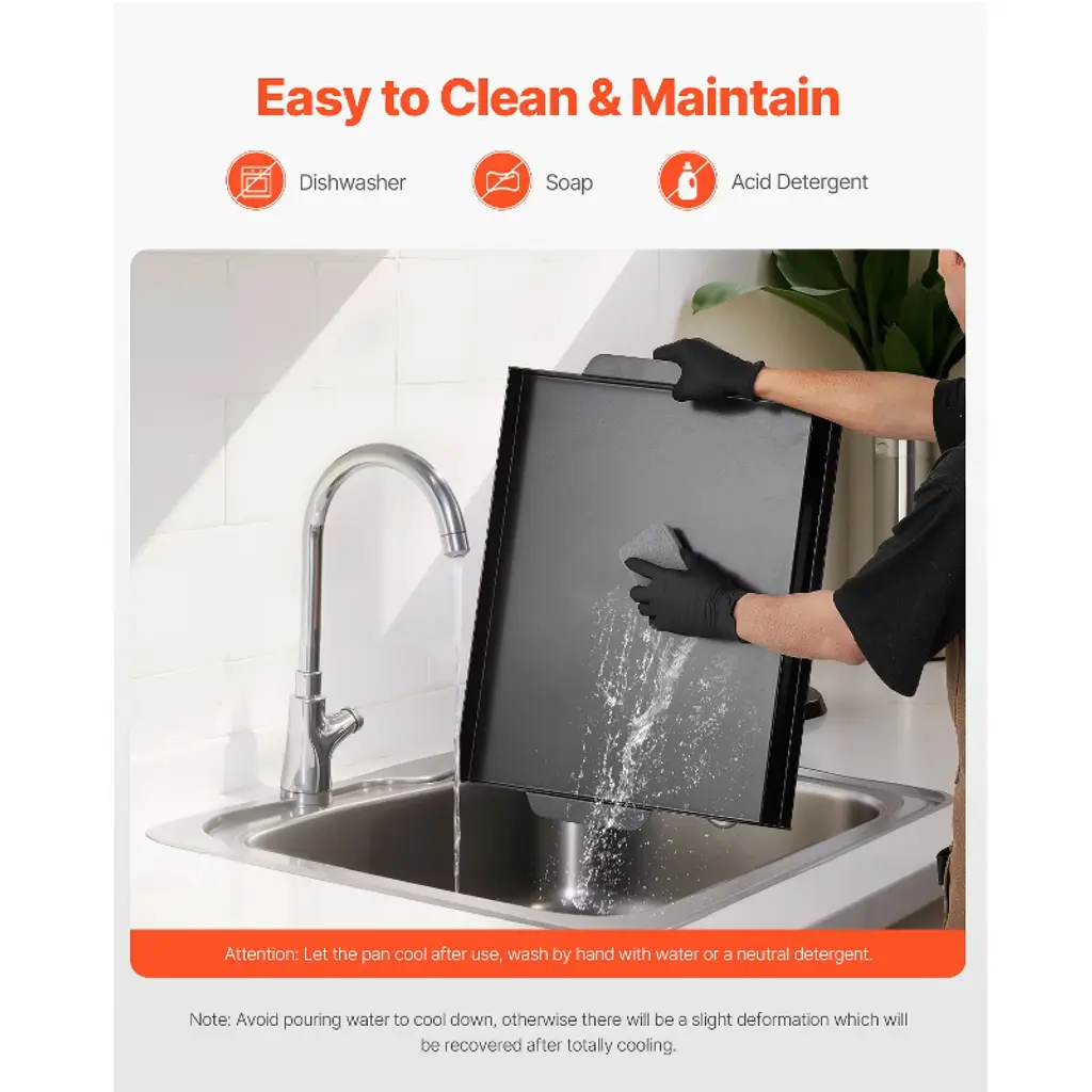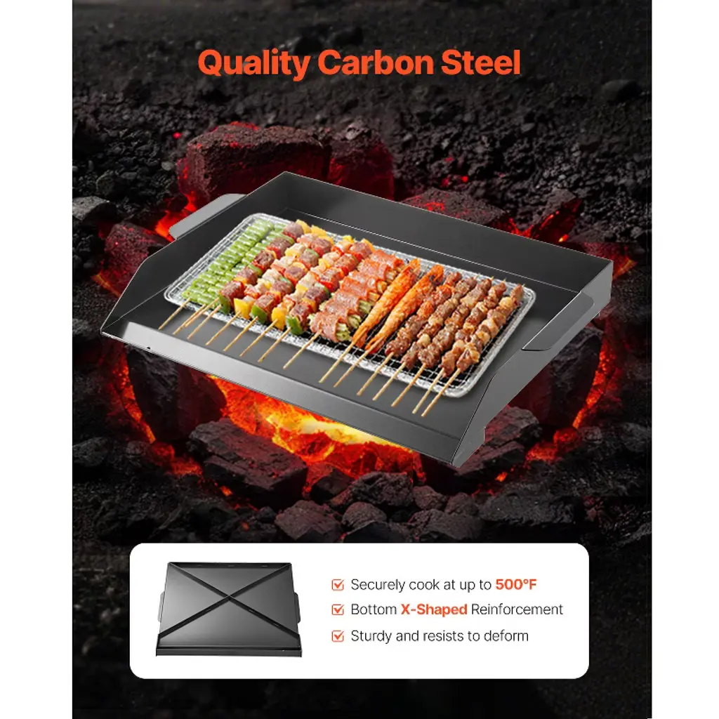 Feature: Quality Carbon Steel: Made of carbon steel with a BPA-free PTFE coating on the surface, this griddle can handle temperatures up to 500℉. Do not dry heat and rinse when hot. The bottom x-shaped reinforcement resists to deform Thoughtful Details: The grease trough and drip hole allow excess oils to drain away, keeping the cooking area clean and promoting healthier meals. Additionally, the sidewalls help keep food in place, preventing spills and making cooking safer and more enjoyable Large Cooking Area: The griddle top offers a large cooking area, providing ample space to cook multiple servings at once, making it great for family meals or entertaining guests Easy to Clean and Maintain: The carbon steel with PTFE coating is easy to maintain. Use wooden or silicone utensils for cooking and soft sponges for cleaning. Prevent scratches on the surface with hard objects. Do not clean with abrasive materials Suitable for Most Stovetops: Whether you have a gas, electric stovetop, this griddle for gas grill is compatible with all. Its sturdy design ensures consistent heat distribution, providing excellent results on most cooking surfaces Package Content 1 x Griddle Pan 2 x SIL Griddle Spatulas (Perforated/Solid Design) 1 x Manual