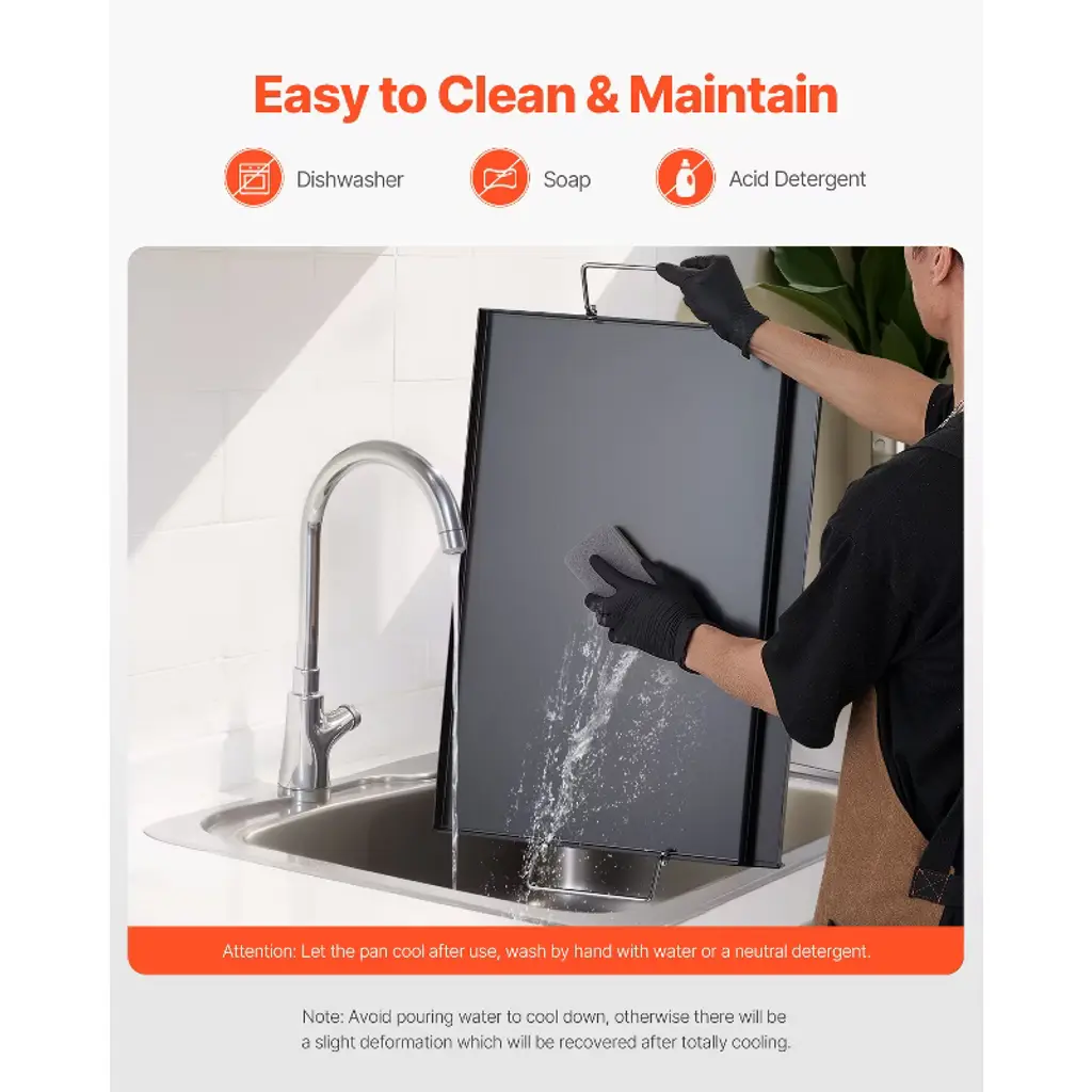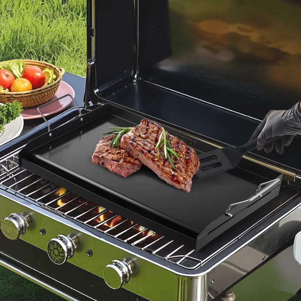 Feature: Quality Carbon Steel: Made of carbon steel with a BPA-free PTFE coating on the surface, this griddle can handle temperatures up to 500℉. Do not dry heat and rinse when hot. The bottom x-shaped reinforcement resists to deform Thoughtful Details: The stove top griddle features removable handles for easy storage, a grease trough to prevent flare-ups, sidewalls to keep food in place, and hollow vents for even airflow, ensuring a safer, cleaner, and more efficient cooking experience Large Cooking Area: The griddle top offers a large cooking area, providing ample space to cook multiple servings at once, making it great for family meals or entertaining guests Easy to Clean and Maintain: The carbon steel with PTFE coating is easy to maintain. Use wooden or silicone utensils for cooking and soft sponges for cleaning. Prevent scratches on the surface with hard objects. Do not clean with abrasive materials Suitable for Most Stovetops: Whether you have a gas, electric stovetop, this griddle for gas grill is compatible with all. Its sturdy design ensures consistent heat distribution, providing excellent results on most cooking surfaces Package Content 1 x Griddle Pan 2 x SIL Griddle Spatulas (Perforated/Solid Design) 2 x Stainless Steel Handles 1 x Manual