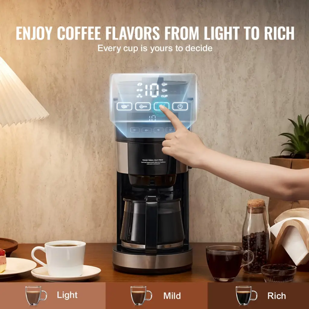 Vevor Coffee Maker With Grinder, 10 Cup Coffee Machine, Grind And Brew Coffee Maker With 3 Brew Strength Control, Drip Coffee Maker
