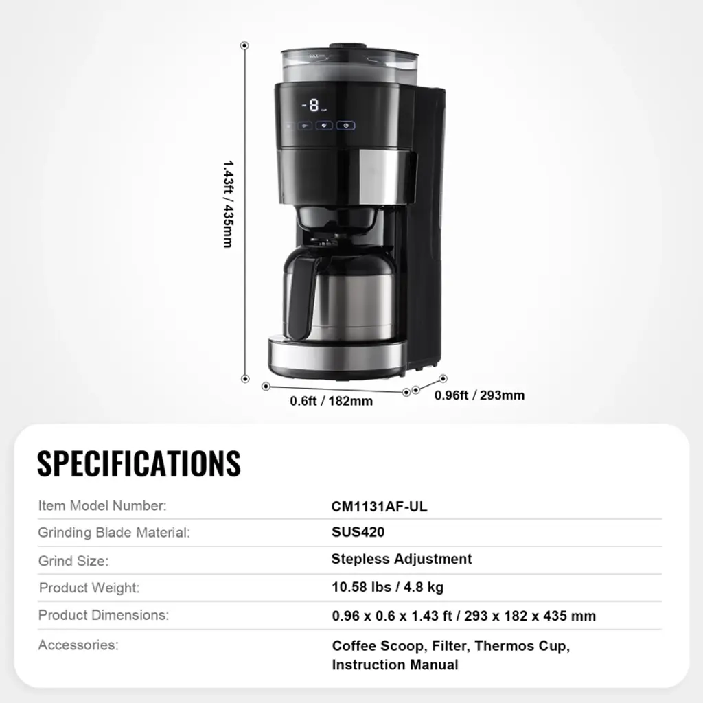 Vevor Coffee Maker With Grinder, 8 Cup Programmable Coffee Machine, Grind And Brew Coffee Maker With 24-hour Timer For Auto Brew, Reusable Filter