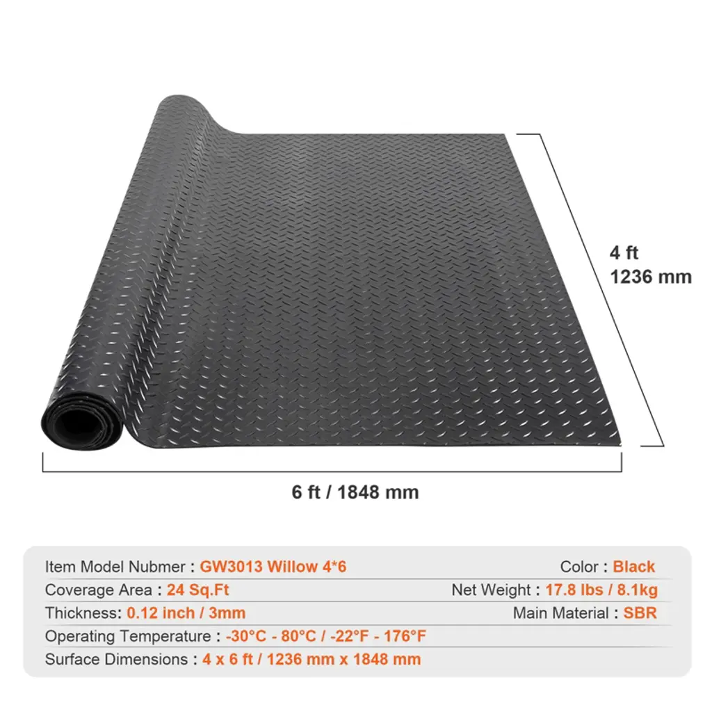 Feature: Multi-Scene Versatility: Our rubber flooring roll is a versatile solution designed to cover various scenarios. Whether you need professional protection for your garage or want to add comfortable cushioning in places like warehouses, gyms, or sidewalks, our garage floor mat has got you covered. 0.12-Inch Thick Rubber: Crafted with a thickness of 0.12 inches (3mm) using high-quality SBR rubber, our rubber garage floor mat ensures outstanding durability and provides a strong grip. It won't roll up under your vehicle, delivering long-lasting floor protection. Waterproof and Leak-Proof: Our diamond plate rubber mat features a 3D diamond pattern backing to effortlessly handle water stains and spills, preventing them from seeping through. After use, your floor will remain spotless, looking as good as new. Easy to Clean and Cut: Easily trim the mat to fit your specific needs and ensure a perfect fit for any space. Plus, our garage flooring roll is easy to clean, quickly restoring its pristine condition even in heavily soiled environments, making it reusable. Superior Protection: Our garage mat provides comprehensive protection for your flooring, even for surfaces prone to damage. It prevents slipping and stays securely in place, ensuring your mat won't shift during use. Package Content: 1 x Rubber Flooring Roll 1 x User Manual