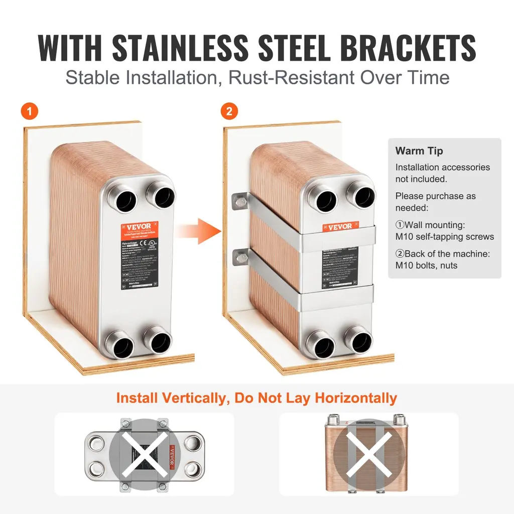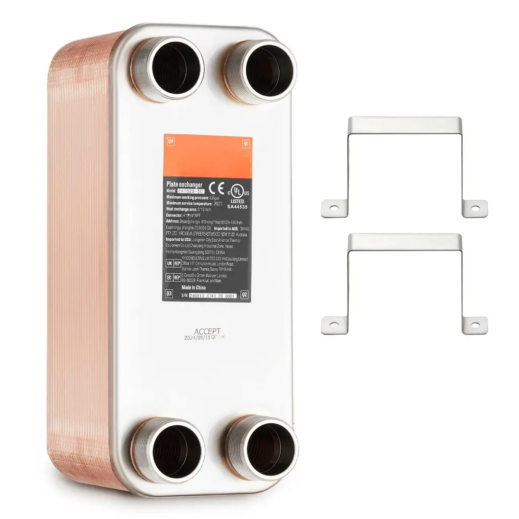 High-Quality Materials: Made of 316L stainless steel with 99% copper brazing at edges and contact points, forming a robust and leak-resistant unit that withstands high pressure and temperature. UL and CE certified for reliable quality. Efficient Heat Transfer: The high-conductivity stainless steel plates feature an asymmetrical herringbone pattern, creating intense pressure turbulence for efficient heating/cooling. With up to 99% heat efficiency, it generates 780-1080K(80 plates option) / 260-360K(30 plates option) / 1100-1260K(100 plates option) / 500-660K(50 plates option) BTU per hour, saving pump power and electricity, reducing overall application costs.Large Heat Exchange Area: The heat exchanger features 5"x12" plates with up to 80 plates / 30 plates / 100 plates / 50 plates , providing excellent heat transfer performance for maximum efficiency. Suitable for operating temperatures from -292℉ to 392℉. Tight and Leak-Proof: To eliminate the possibility of micro-leaks, the heat exchanger uses high-pressure vacuum brazing and undergoes helium leak testing, ensuring long life and high reliability. Stable Installation: Includes two stainless steel brackets made of 304 stainless steel, offering excellent rust resistance and stability for easy and secure mounting of the heat exchanger. Package Content Heat Exchanger x 1 Mounting Brackets x 2