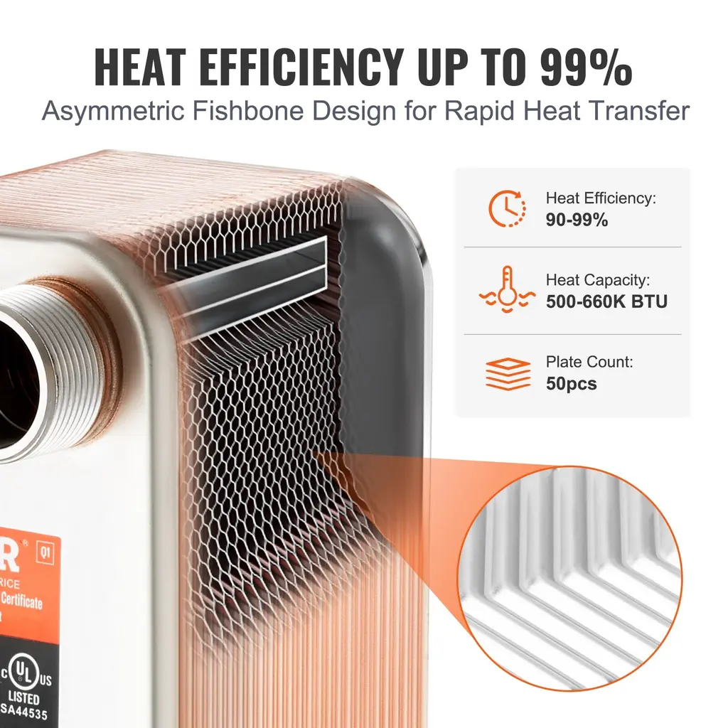 Vevor Heat Exchanger,brazed Plate Heat Exchanger For Floor Heating, Water Heating, Snow Melting, Beer Cooling - 5"x 12" 50 Plates