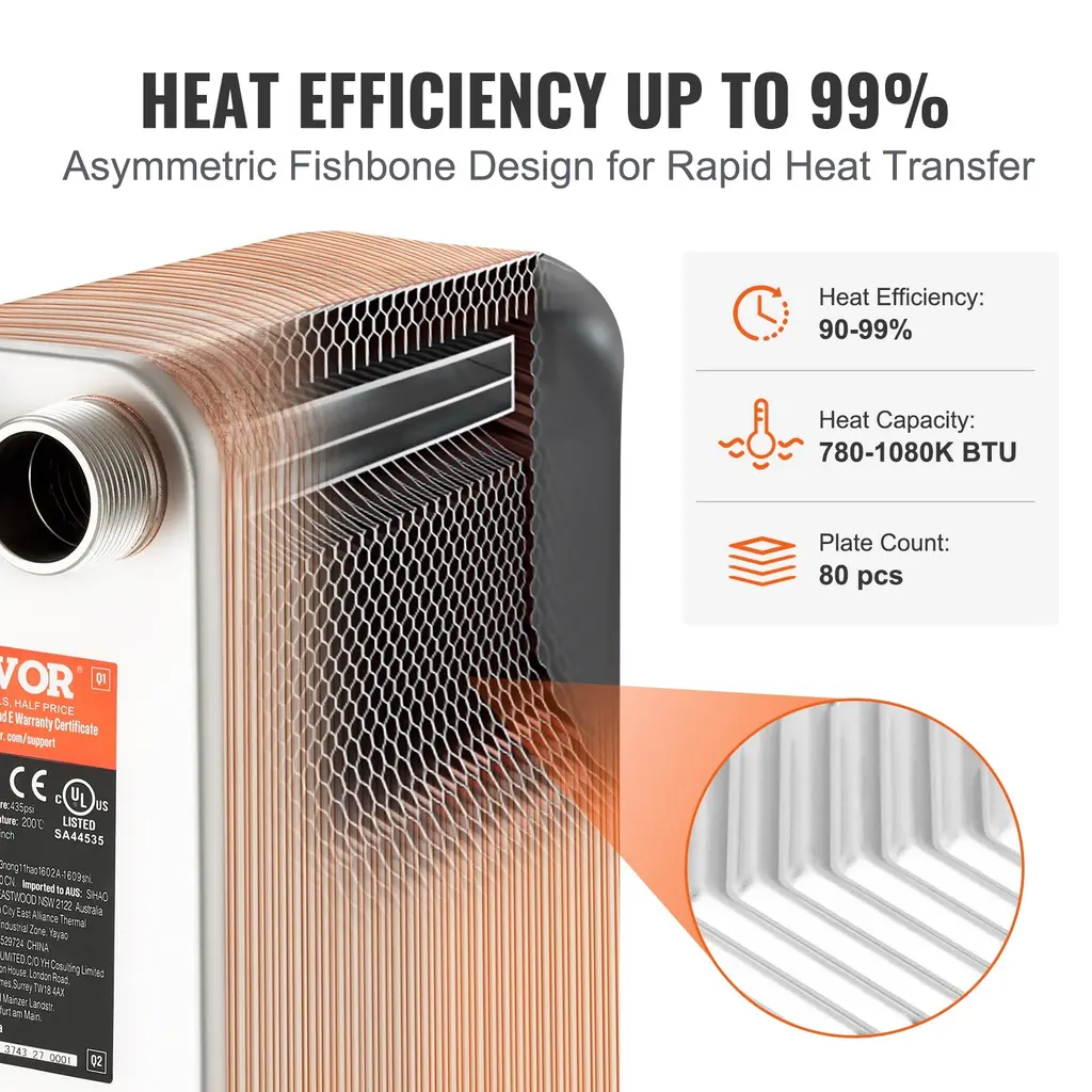 Vevor Heat Exchanger,brazed Plate Heat Exchanger For Floor Heating, Water Heating, Snow Melting, Beer Cooling - 5"x 12" 80 Plates