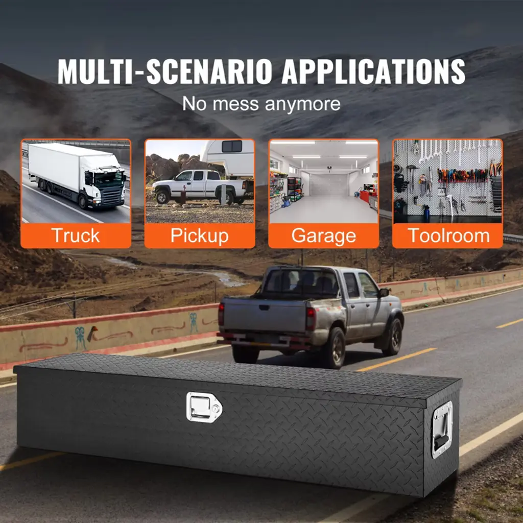 Feature: Last A Lifetime: VEVOR truck tool box is constructed from lightweight yet durable aluminum alloy, featuring a diamond tread pattern and double-sided power coating process. This design helps to prevent rust, corrosion, and abrasion, ensuring long-lasting use for several years. Additionally, the tool box is equipped with upgraded corners to secure the packaging and prevent any damage or deformation during transportation. Bulk-storage Toolbox: This spacious toolbox measures 48 x 15 x 15 inches, providing plenty of room for buckets, maintenance tools, fire extinguishing canisters, warning signs, and other items in your truck. It's versatile and can be used in pickups, trucks, trailers, RVs, and even at home. You no longer need to worry about misplacing small objects with this toolbox. Nothing Is Getting In: Our truck toolbox is a must-have choice for your vehicle. It comes with an overhanging door that features a tight seal to prevent water from seeping in. This ensures that your box items remain dry and tidy, even in harsh rainy or snowy conditions. Safety Comes First: Equipped with stainless steel locking mechanism and 2 exclusive keys, providing effective protection against theft. Additionally, its built-in design helps to reduce impact and scratches during driving, ensuring the longevity of your toolbox. Lift with Ease: Features wider carrying handles on both sides, making the tool box is easy to grip even with gloves on. Men with larger hands will find it comfortable to carry without feeling crowded. Moreover, it comes with a gas strut that assists in opening the lid up to 110°, providing full access to all contents within the toolbox. Package Content: 1 x Truck Tool Chest Box (48 x 15 x 15 inch) 2 x Keys