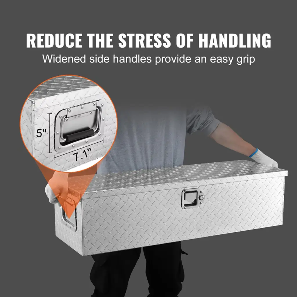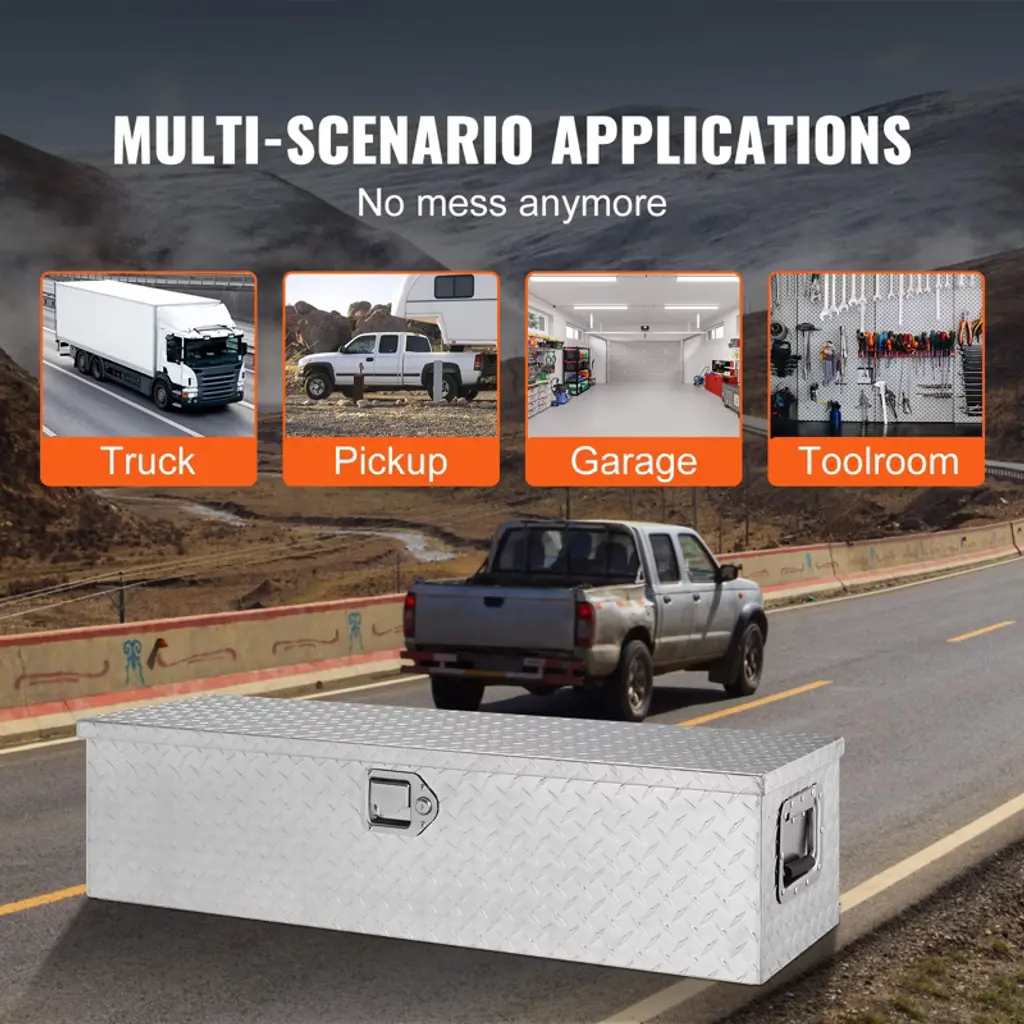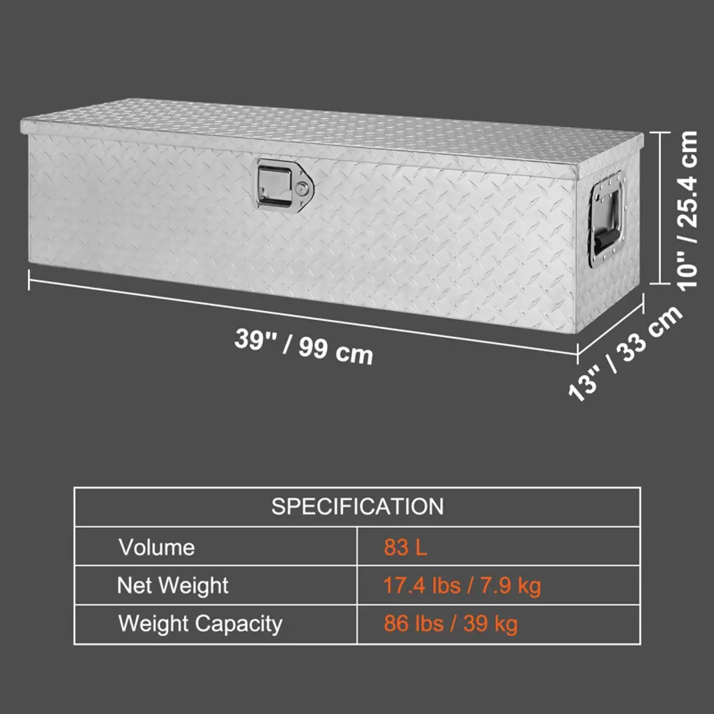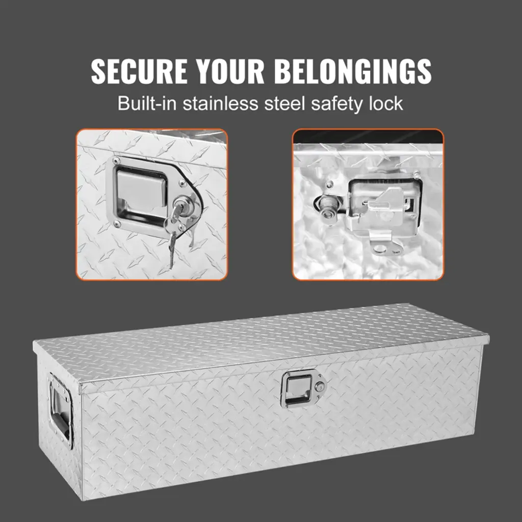 Feature: Last A Lifetime: VEVOR truck tool box is constructed from lightweight yet durable aluminum alloy, featuring a diamond tread pattern and double-sided power coating process. This design helps to prevent rust, corrosion, and abrasion, ensuring long-lasting use for several years. Additionally, the tool box is equipped with upgraded corners to secure the packaging and prevent any damage or deformation during transportation. Bulk-storage Toolbox: This spacious toolbox measures 39 x 13 x 10 inches, providing plenty of room for buckets, maintenance tools, fire extinguishing canisters, warning signs, and other items in your truck. It's versatile and can be used in pickups, trucks, trailers, RVs, and even at home. You no longer need to worry about misplacing small objects with this toolbox. Nothing Is Getting In: Our truck toolbox is a must-have choice for your vehicle. It comes with an overhanging door that features a tight seal to prevent water from seeping in. This ensures that your box items remain dry and tidy, even in harsh rainy or snowy conditions. Safety Comes First: Equipped with stainless steel locking mechanism and 2 exclusive keys, providing effective protection against theft. Additionally, its built-in design helps to reduce impact and scratches during driving, ensuring the longevity of your toolbox. Lift with Ease: Features wider carrying handles on both sides, making the tool box is easy to grip even with gloves on. Men with larger hands will find it comfortable to carry without feeling crowded. Moreover, it comes with a gas strut that assists in opening the lid up to 110°, providing full access to all contents within the toolbox. Package Content: 1 x Truck Tool Chest Box (39 x 13 x 10 inch) 2 x Keys