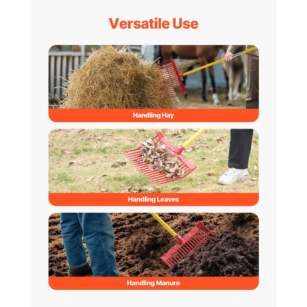 Feature: Durable & Long-Lasting: The fiberglass handle design significantly enhances wear resistance, extending the tool's lifespan. Whether you're handling routine yard maintenance or frequent farm tasks, this tool is built to perform with durability and ease. Reduced Spillage: The horse manure fork features a unique angled, pointed tooth design that effectively minimizes spillage when handling hay or other loose materials. This design improves the tool's ability to grip and secure materials more efficiently. Easy Assembly & Secure Fit: The muck fork with reinforced connection ensures no loosening or wobbling during use, providing secure and reliable operation. The tool is easy to assemble and disassemble, making it convenient for storage even in limited spaces without occupying too much room. Easy to Control: With a total length of 61 in, this garden fork is easy to manage, even for older adults and women. Whether bending down to turn soil or frequently picking up materials, it reduces strain on the body and makes tasks easier to complete. Versatile Use: Ideal for handling large piles of leaves and pine needles, this muck fork tool is also suitable for moving mulch, wood chips, manure, hay, and more. However, it is not suitable for digging. From leaves to straw, it can handle a wide range of tasks effortlessly. Package Content: 1 x User Manual