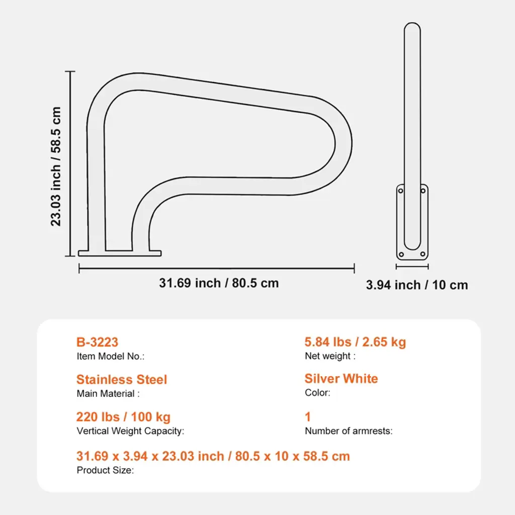 Feature: 304 Stainless Steel Pool Handrail: Our pool handrails are crafted from durable 304 stainless steel, designed to withstand wave impacts. Anodized for UV protection, they resist deformation and feature precise welding, making them perfect for outdoor pools. Supports Up to 220 lbs: With exceptional weight capacity, our pool safety rails provide secure support for both adults and children. The seamless one-piece design is sturdy and durable, with thickened pipe walls and base for added strength. Easy Assembly: We provide a complete set of installation tools for quick setup on concrete, wood, tile, or marble surfaces. All necessary components, including an open-end wrench and drill bits, are included for effortless installation. Stable Structure: The unique three-stage bend design allows for a secure grip when boarding, offering safety and ease of use. Soft, comfortable non-slip grips ensure stability while occupying minimal space. Elegant and Functional: This handrail combines durability with an elegant silver-white finish, featuring a refined texture that complements any setting. Whether by an outdoor pool, spa, or water park, it enhances both safety and aesthetics. Package Content Pool Handrail x 1 Stainless Steel 304 Hexagonal Tapping Screws M8 x 60 x 4 Galvanized Expansion Pipe 12 x 60 x 4 White Plastic Cap x 4 Open End Wrench 10-13 x 1 Drill Bit 12 x 150 x 1 Dusting Cloths x 1 Armrest Gloves 175 x 1850 mm x 1 Instruction Manual x 1