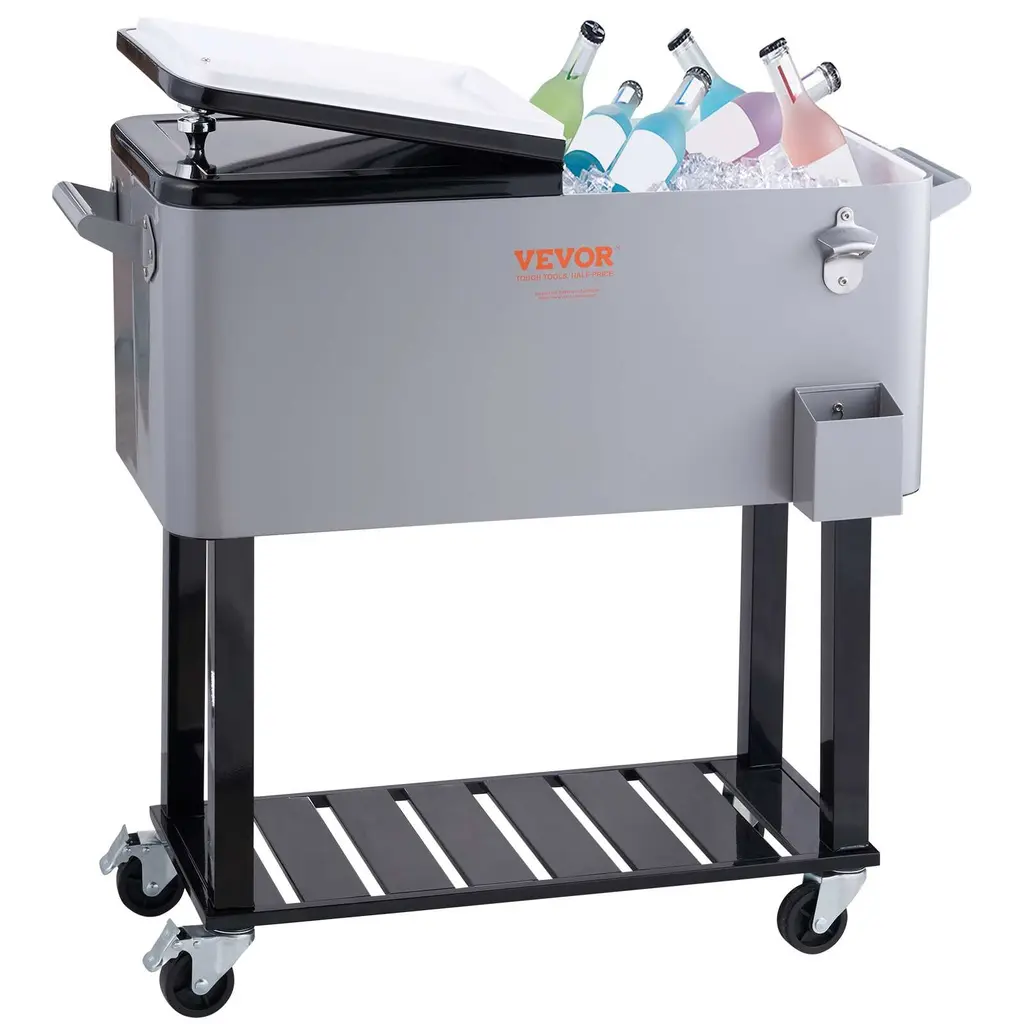 Vevor Rolling Ice Chest Cooler Cart 80 Quart Beverage Bar Stand Up Cooler With Wheels & Bottle Opener Fda Listed - Sliver