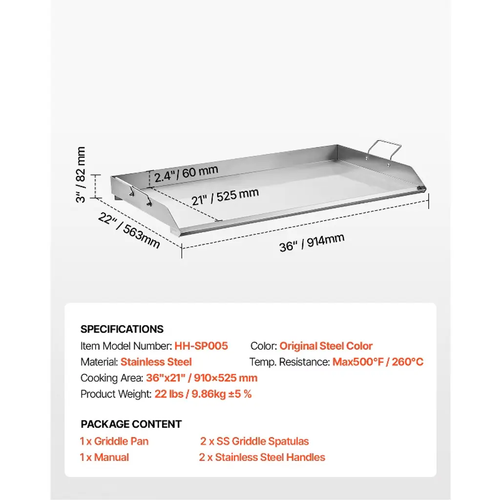 Feature: Quality Stainless Steel: Made from durable stainless steel, this griddle for gas grill can handle temperatures up to 500℉, giving you the freedom to cook at high heat. The bottom x-shaped reinforcement resists to deform Thoughtful Details: The grease trough and drip hole allow excess oils to drain away, keeping the cooking area clean and promoting healthier meals. Additionally, the sidewalls help keep food in place, preventing spills and making cooking safer and more enjoyable Large Cooking Area: The griddle top offers a large cooking area, providing ample space to cook multiple servings at once, making it great for family meals or entertaining guests Easy to Clean & Maintain: The cast iron construction is built to last and easy to maintain. Simply wipe it down after use with a cloth to preserve its surface. With proper care, this little griddle will provide reliable cooking performance for years to come Suitable for Most Stovetops: Whether you have a gas, electric stovetop, this griddle for gas grill is compatible with all. Its sturdy design ensures consistent heat distribution, providing excellent results on most cooking surfaces Package Content 1 x Griddle Pan 2 x SS Griddle Spatulas (Perforated/Solid Design) 2 x Stainless Steel Handles 1 x Manual