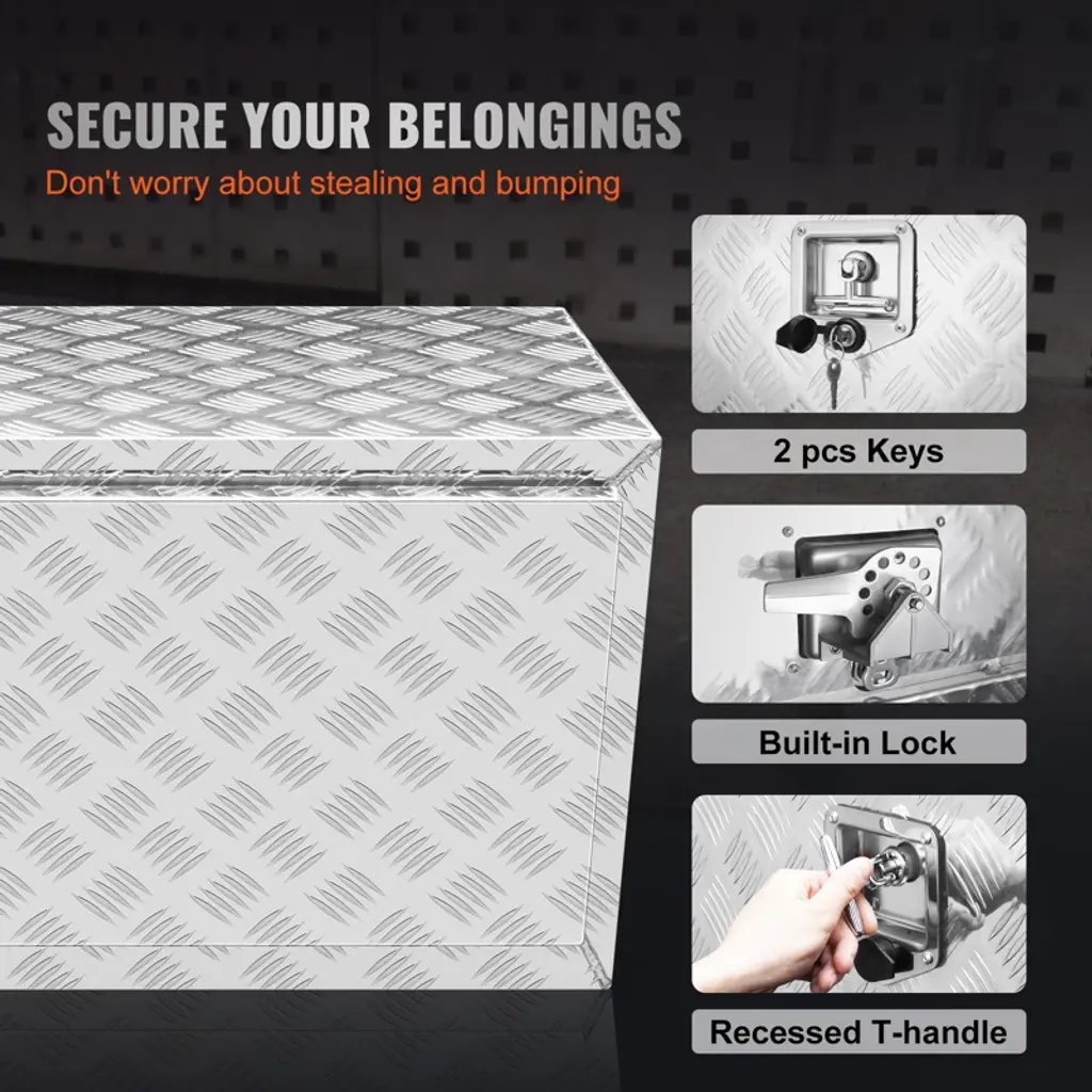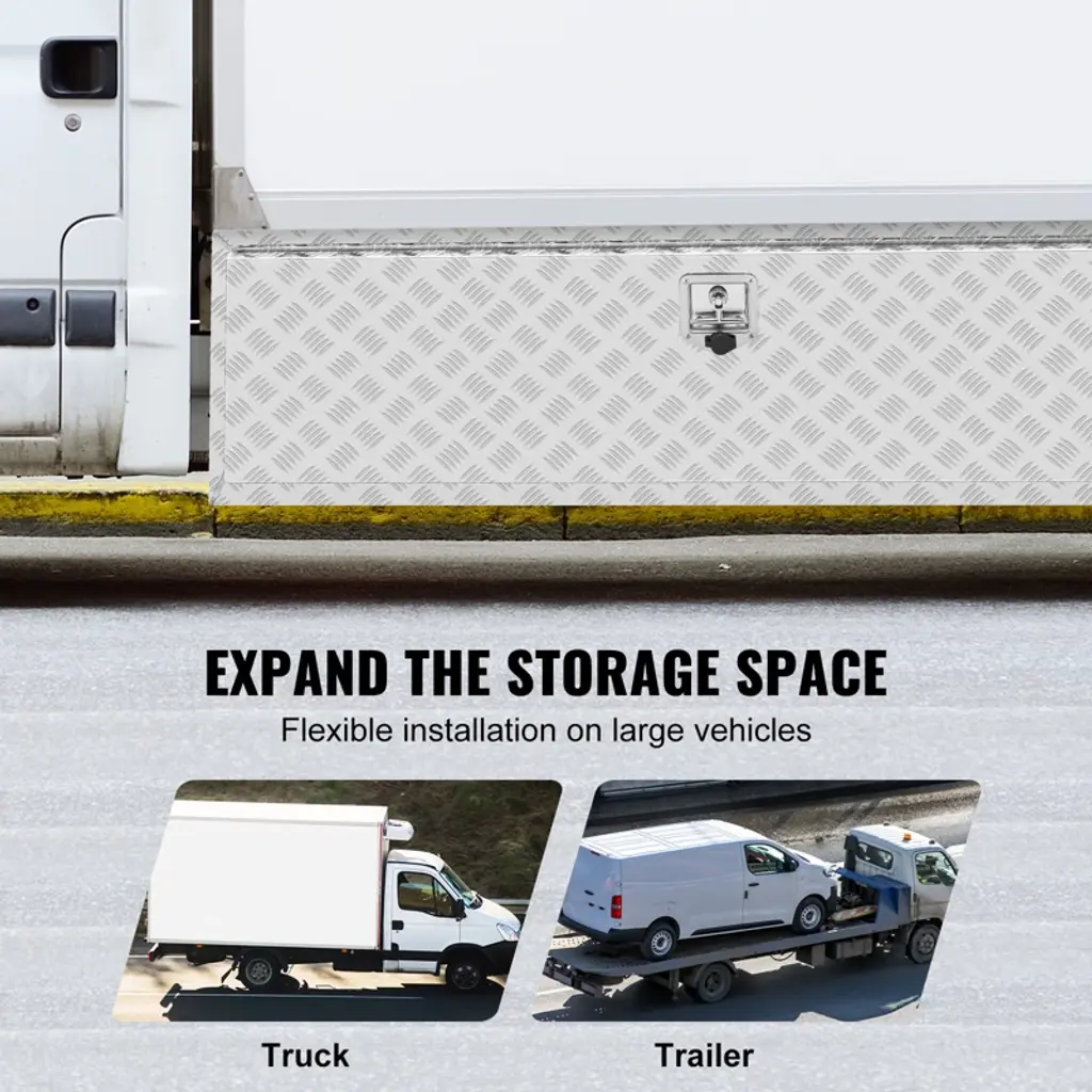 Feature: All-Purpose Toolbox for Anywhere: Are you tired of being unorganized? The VEVOR underbody tool box can be installed not only on trucks' and trailers' bottoms, but also in different places, such as the back of a camper or pickup rack. You can store all your needs, from maintenance tools to camping equipment, in this truck box and keep everything organized. Nothing Gets In: The rubber sealing strip on this toolbox creates a tight seal when closed, preventing water from seeping in. You can keep your items dry even on rainy days, without fear of rust or corrosion. Put your belongings in this toolbox with confidence! Built to Last: The robust aluminum alloy material of this truck box provides rust prevention and corrosion resistance that cannot be compared to iron. The thickened panel and tread pattern design ensure that the truck box is not easily damaged or scratched during long-term road driving. Safety Comes First: The embedded T-shaped handle of this underbody box is designed without bulge, making it resistant to scratches and hits during driving. The box is lockable and comes with two exclusive keys to ensure the security of your items. Increase your underbody storage space with this truck box and have peace of mind knowing your belongings are safe from theft. Install In No Time: This underbody truck box measures 60 x 17 x 18 inches/1524×430×460 mm, so make sure to measure your vehicle's underbody space before purchasing. VEVOR provides a variety of dimensions to meet your needs. You can also purchase brackets to install or do a DIY assembly yourself. Note that if you assemble the truck box on the vehicle, make sure to turn off the power to prevent a short circuit. Package Content 1 x Underbody Tool Box 2 x Keys